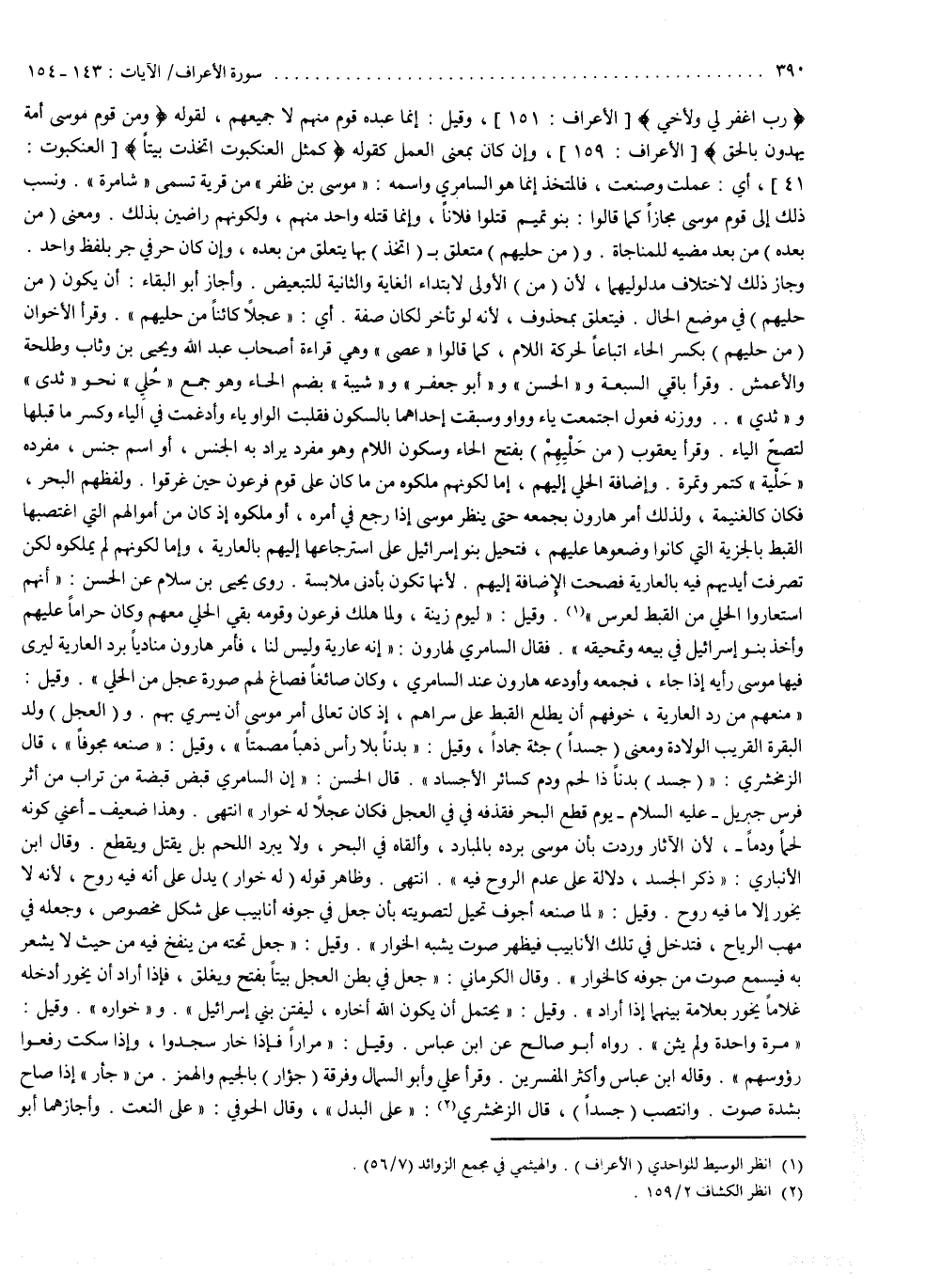 رَبّ اغْفِرْ لِى وَلاخِى ( ، وقيل إنما عبده قوم منهم لا جميعهم لقوله : ) وَمِن قَوْمِ مُوسَى أُمَّةٌ يَهْدُونَ بِالْحَقّ ( وإن كان بمعنى العمل كقوله ) كَمَثَلِ الْعَنكَبُوتِ اتَّخَذَتْ بَيْتاً ( أي عملت وصنعت فالمتخذ إنما هو السامري واسمه موسى بن ظفر من قرية تسمى سامرة ونسب ذلك إلى قوم موسى مجازاً كما قالوا بنو تميم قتلوا فلاناً وإنما قتله واحد منهم ولكونهم راضين بذلك ومعنى ) مِن بَعْدِهِ ( من بعد مضيه للمناجاة ومن حليّهم متعلق باتخذ وبها يتعلق من بعده وإن كانا حر في جرّ بلفظ واحد وجاز ذلك لاختلاف مدلوليهما لأنّ من الأولى لابتداء الغاية والثانية للتبعيض وأجاز أبو البقاء أن يكون ) مِنْ حُلِيّهِمْ ( في موضع الحال فيتعلق بمحذوف لأنه لو تأخر لكان صفة أي ) عِجْلاً ( كائناً من حليهم . وقرأ الأخوان من ) حُلِيّهِمْ ( بكسر الحاء اتباعاً لحركة اللام كما قالوا : عصى ، وهي قراءة أصحاب عبد الله ويحيى بن وثاب وطلحة والأعمش ، وقرأ باقي السبعة والحسن وأبو جعفر وشيبة بضم الحاء وهو جمع حلى نحو ثدي وثدى ووزنه فعول اجتمعت ياء وواو وسبقت إحداهما بالسكون فقلبت الواو ياء وأدغمت في الياء وكسر ما قبلها لتصحّ الياء ، وقرأ يعقوب ) مِنْ حُلِيّهِمْ ( بفتح الحاء وسكون اللام وهو مفرد يراد به الجنس أو اسم جنس مفرده حلية كتمر وتمره ، وإضافة الحلى إليهم إما لكونهم ملكوه من ما كان على قوم فرعون حين غرقوا ولفظهم البحرفكان كالغنيمة ولذلك أمر هارون بجمعه حتى ينظر موسى إذا رجع في أمره أو ملكوه إذ كان من أموالهم التي اغتصبها القبط بالجزية التي كانوا وضعوها عليهم فتحيل بنو إسرائيل عل استرجاعها إليهم بالعارية وإما لكونهم لم يملكوه لكن تصرفت أيديهم فيه بالعارية فصحت الإضافة إليهم لأنها تكون بأدنى ملابسة . روى يحيى بن سلام عن الحسن : أنهم استعاروا الحلى من القبط لعرس ، وقيل : اليوم زينة ولما هلك فرعون وقومه بقي الحلى معهم وكان حراماً عليهم وأخذ بنو إسرائيل في بيعه وتمحيقه ، فقال السامريّ لهارون : إنه عارية وليس لنا فأمر هارون منادياً بردّ العارية ليرى فيها موسى رأيه إذا جاء فجمعه وأودعه هارون عند السامري وكان صائغاً فصاغ لهم صورة عجل من الحلى ، وقيل : منعهم من ردّ العارية خوفهم أن يطلع القبط على سُراهم إذ كان تعالى أمر موسى أن يسري بهم ، والعجل ولد البقرة القريب الولادة ومعنى جسداً جثة جماداً ، وقيل : بدناً بلا رأس ذهباً مصمتاً ، وقيل : صنعه مجوفاً ، قال الزمشخري : جسداً بدناً ذا لحم ودم كسائر الأجساد ، قال الحسن : إنّ السامريّ قبض قبضة من تراب من أثر فرس جبريل عليه السلام يوم قطع البحر فقذفه في في العجل فكان عجلاً له خوار انتهى . وهذا ضعيف أعني كونه لحماً ودماً لأنّ الآثار وردت بأن موسى برده بالمبارد وألقاه في البحر ولا يبرد اللحم بل كان يقتل ويقطع ، وقال ابن الأنباري : ذكر الجسد دلالة على عدم الروح فيه انتهى ، وظاهر قوله له خوار يدلّ على أنه فيه روح لأنه لا يخور إلا ما فيه روح ، وقيل : لما صنعه أجوف تحيل لتصويته بأن جعل في جوفه أنابيب على شكل مخصوص وجعله في مهبّ الرياح فتدخل في تلك الأنابيب فيظهر صوت يشبه الخوار ، وقيل : جعل تحته من ينفخ فيه من حيث لا يشعر به فيسمع صوت من جوفه كالخوار ، وقال الكرماني : جعل في بطن العجل بيتاً يفتح ويغلق فإذا أراد أن يخور أدخله غلاماً يخور بعلامة بينهما إذا أراد ، وقيل : يحتمل أن يكونن الله أخاره ليفتن بني إسرائيل وخواره ، قيل : مرة واحدة ولم يثنِ رواه أبو صالح عن ابن عباس ، وقيل : مراراً فإذا خار سجدوا وإذا سكت رفعوا رؤوسهم ، وقاله ابن عباس وأكثر المفسرين ، وقرأ علي وأبو السّمأل وفرقة جوار : بالجيم والهمز من جأر إذا صاح بشدّة صوت وانتصب ) جَسَداً ( ، قال الزمخشري على البدل ، وقال الحوفي على النعت وأجازهما أبو