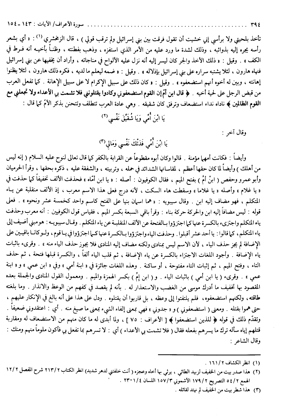 ( قَالَ ابْنَ أُمَّ إِنَّ الْقَوْمَ اسْتَضْعَفُونِى وَكَادُواْ يَقْتُلُونَنِى فَلاَ تُشْمِتْ بِىَ الاعْدَاء وَلاَ تَجْعَلْنِى مَعَ الْقَوْمِ الظَّالِمِينَ ( ناداه نداء استضعاف وترفق وكان شقيقه وهي عادة العرب تتلطف وتتحنن بذكر الأمّ كما قال : يا ابن أمي ويا شقيق نفسي وقال آخر :