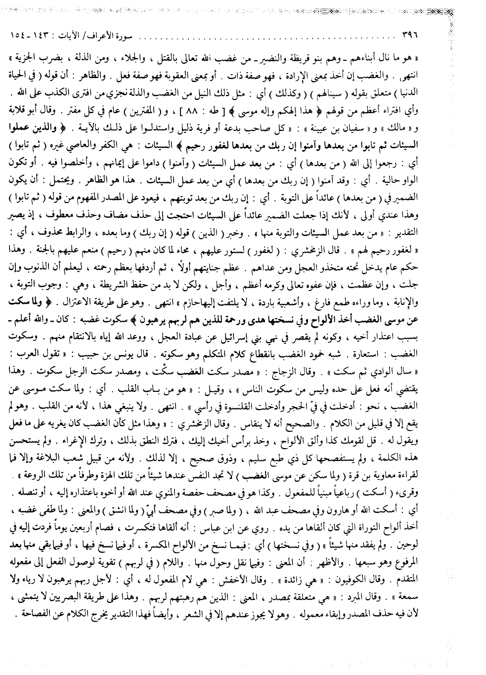( وَلَمَّا سَكَتَ عَن مُّوسَى الْغَضَبُ أَخَذَ الاْلْوَاحَ وَفِى نُسْخَتِهَا هُدًى وَرَحْمَةٌ لّلَّذِينَ هُمْ لِرَبّهِمْ يَرْهَبُونَ ). سكوت غضبه كان والله أعلم بسبب اعتذار أخيه وكونه لم يقصر في نهي بني إسرائيل عن عبادة العجل ووعد الله إياه بالانتقام منهم وسكوت الغضب استعارة شبه خمود الغضب بانقطاع كلام المتكلم وهو سكوته . قال يونس بن حبيب : تقول العرب سال الوادي ثم سكت ، وقال الزجاج : مصدر ) سَكَتَ ( الغضب سكت ومصدر سكت الرجل سكوت وهذا يقتضي أنه فعل على حدّه وليس من سكوت الناس ، وقيل هو من باب القلب أي ولمّا سكت موسى عن الغضب نحو أدخلت في فيّ الحجر ، وأدخلت القلنسوة في رأسي انتهى ، ولا ينبغي هذا لأنه من القلب وهو لم يقع إلاّ في قليل من الكلام والصحيح أنه لا ينقاس ، وقال الزمخشري وهذا مثل كأنّ الغضب كان يغريه على ما فعل ويقول له قل لقومك كذا وألق الألواح وخذ برأس أخيك إليك فترك النطق بذلك وترك الإغراء ولم يستحسن هذه الكلمة ولم يستفصحها كل ذي طبع سليم وذوق صحيح إلا لذلك ولأنه من قبيل شعب البلاغة ، وإلا فما لقراءة معاوية بن قرة ولما سكن عن موسى الغضب لا تجد النفس عندها شيئاً من تلك الهزة وطرفاً من تلك الروعة ، وقرىء أسكت رباعيّاً مبنيّاً للمفعول ، وكذا هو في مصحف حفصة والمنوي عند الله أو أخوه باعتذاره إليه أو تنصله أي أسكت الله أو هارون ، وفي مصحف عبد الله ولما صبر ، وفي مصحف أبي ولما انشق والمعنى ولما طفى غضبه أخذ ألواح التوراة التي كان ألقاها من يده ، روي عن ابن عباس أنه ألقاها فتكسرت فصام أربعين يوماً فردّت إليه في لوحين ولم يفقد منها شيئاً وفي نسختها أي فيما نسخ من الألواح المكسرة أو فيما نسخ فيها أو فيما بقي منها بعد المرفوع وهو سبعها والأظهر أنّ المعنى وفيما نقل وحوّل منها واللام في ) لِرَبّهِمُ ( تقوية لوصول الفعل إلى مفعوله المتقدم ، وقال الكوفيّون : هي زائدة ، وقال الأخفش : هي لام المفعول له أي لأجل ربهم ) يَرْهَبُونَ ( لا رياء ولا سمعة ، وقال المبرد : هي متعلقة بمصدر المعنى الذين هم رهبتهم لربهم وهذا على طريقة البصريين لا يتمشّى لأنّ فيه حذف المصدر وإبقاء معموله وهو لا يجوز عندهم إلا في الشعر وأيضاً فهذا التقدير يخرج الكلام عن الفصاحة .