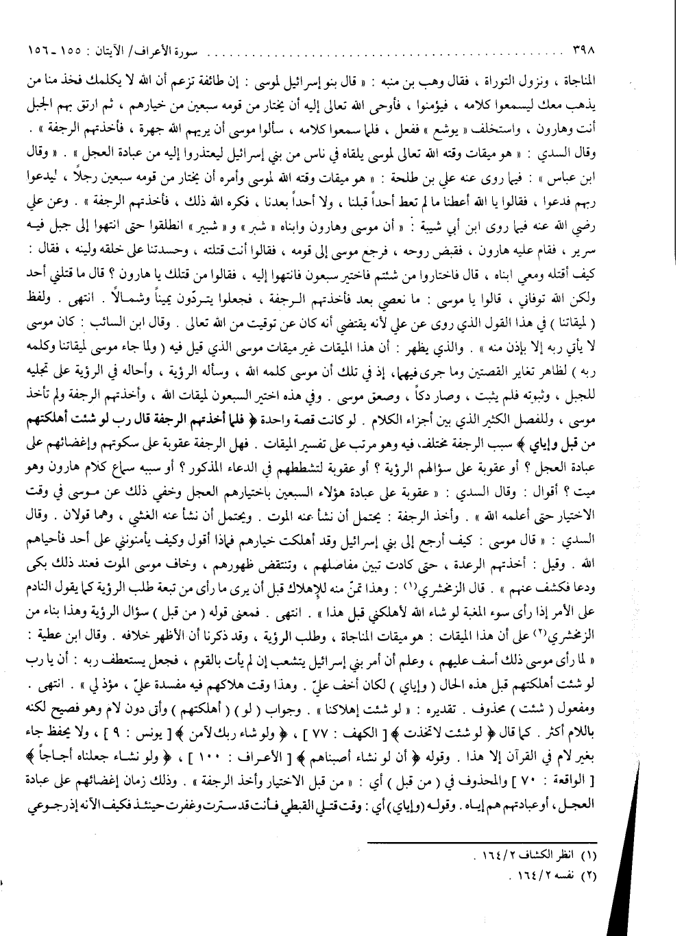 ( فَلَمَّا أَخَذَتْهُمُ الرَّجْفَةُ قَالَ رَبّ لَوْ شِئْتَ أَهْلَكْتَهُم مّن قَبْلُ وَإِيَّاىَ ). سبب الرجفة مختلف فيه وهو مرتب على تفسير الميقات فهل الرّجفة عقوبة على سكوتهم وإغضائهم على عبادة العجل أو عقوبة على سؤالهم الرؤية أو عقوبة لتشططهم في الدعاء المذكور أو سببه سماع كلام هارون وهو ميت أقوال . وقال السدّي : عقوبة على عبادة هؤلاء السبعين باختيارهم العجل وخفي ذلك عن موسى في وقت الاختيار حتى أعلمه الله وأخذ الرّجفة يحتمل أن نشأ عنه الموت ويحتمل أن نشأ عنه الغشي وهما قولان ، وقال السدّي قال موسى : كيف أرجع إلى بني إسرائيل وقد أهلكت خيارهم فماذا أقول وكيف يأمنونني على أحد فأحياهم الله ، وقيل أخذتهم الرّعدة حتى كادت تبين مفاصلهم وتنتقض ظهورهم وخاف موسى الموت فعند ذلك بكى ودعا فكشف عنهم ، قال الزمخشري : وهذا تمنّ منه للإهلاك قبل أن يرى ما رأى من تبعة طلب الرؤية كما يقال النادم على الأمر إذا رأى سوء المغبّة لو شاء الله لأهلكني قبل هذا انتهى . فمعنى قوله ) مِن قَبْلُ ( سؤال الرّؤية وهذا بناء من الزمخشري على أنّ هذا الميقات هو ميقات المناجاة وطلب الرؤية وقد ذكرنا أنّ الأظهر خلافه ، وقال ابن عطية لما رأى موسى ذلك أسف عليهم وعلم أن أمر بني إسرائيل يتشعّب إن لم يأتِ بالقوم فجعل يستعطف ربه أن يا رب لو شئت أهلكتهم قبل هذه الحال وإياي لكان أخفّ عليّ وهذا وقت هلاكهم فيه مفسدة عليّ مؤذٍ لي انتهى ، ومفعول ) شِئْتَ ( محذوف تقديره لو شئت إهلاكنا وجواب ) لَوْ أَهْلَكْتَهُم ( وأتى دون لام وهو فصيح لكنه باللام أكثر كما قال ) لَوْ شِئْتَ لاَتَّخَذْتَ ( ) وَلَوْ شَاء رَبُّكَ لآمَنَ ( ، ولا يحفظ جاء بغير لام في القرآن ألا هذا وقوله ) أَن لَّوْ نَشَاء أَصَبْنَاهُمْ ( و ) لَوْ نَشَاء جَعَلْنَاهُ أُجَاجاً ( والمحذوف في ) مِن قَبْلُ ( أي من قبل الختيار وأخذ الرّجفة وذلك زمان إغضائهم على عبادة العجل أو عبادتهم هم أياه وقوله ) وَإِيَّاىَ ( أي وقت قتلي القبطي فأنت قد سترت وغفرت حينئذ فكيف الآن إذ رجوعي
