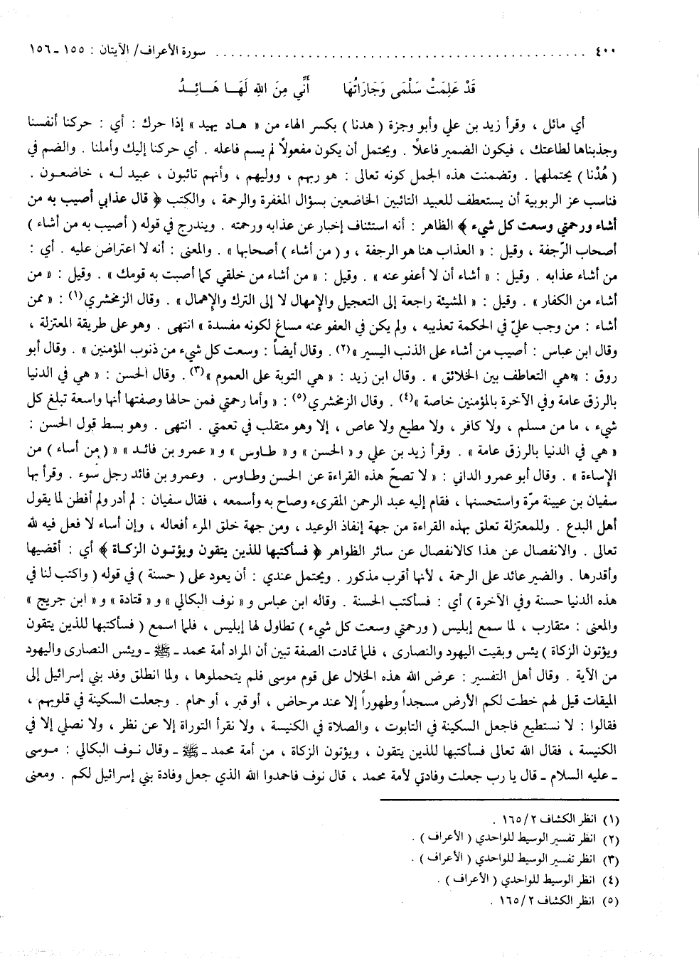( وَاكْتُبْ لَنَا فِى هَاذِهِ الدُّنْيَا ). أي أقضيها وأقدّرها والضمير عائد على الرحمة لأنها أقرب مذكور ويحتمل عندي أن يعود على حسنة في قوله واكتب لنا في هذه الدنيا حسنة وفي الآخرة أي فسأكتب الحسنة وقاله ابن عباس ونوف البكالي وقتادة وابن جريج والمعنى متقارب لما سمع إبليس ورحمتي وسعت كل شيء تطاول لها إبليس فلما سمع فسأكتبها للذين يتقون ويؤتون الزكاة يئس ، وبقيت اليهود والنصارى فلما تمادت الصفة تبين أنّ المراد أمة محمد ( صلى الله عليه وسلم ) ) ويئس النصارى واليهود من الآية ، وقال أهل التفسير : عرض الله هذه الخِلال على قوم موسى فلم يتحملوها ولما انطلق وفد بني إسرائيل إلى الميقات قيل : لهم خطت لكم الأرض مسجداً وطهوراً إلا عند مرحاض أو قبر أو حمام وجعلت السّكينة في قلوبهم فقالوا : لا نستطيع فاجعل السكينة في التابوت والصلاة في الكنيسة ولا نقرأ التوراة إلا عن نظر ولا نصلي إلا في الكنيسة فقال الله تعالى : فسأكتبها للذين يتقون ويؤتون الزكاة من أمة محمد ( صلى الله عليه وسلم ) ) ، وقال نوف البكالي : إن موسى عليه السلام قال : يا رب جعلت وفادتي لأمة محمد ، قال نوف فاحمدوا الله الذي جعل وفادة بني إسرائيل لكم ومعنى
