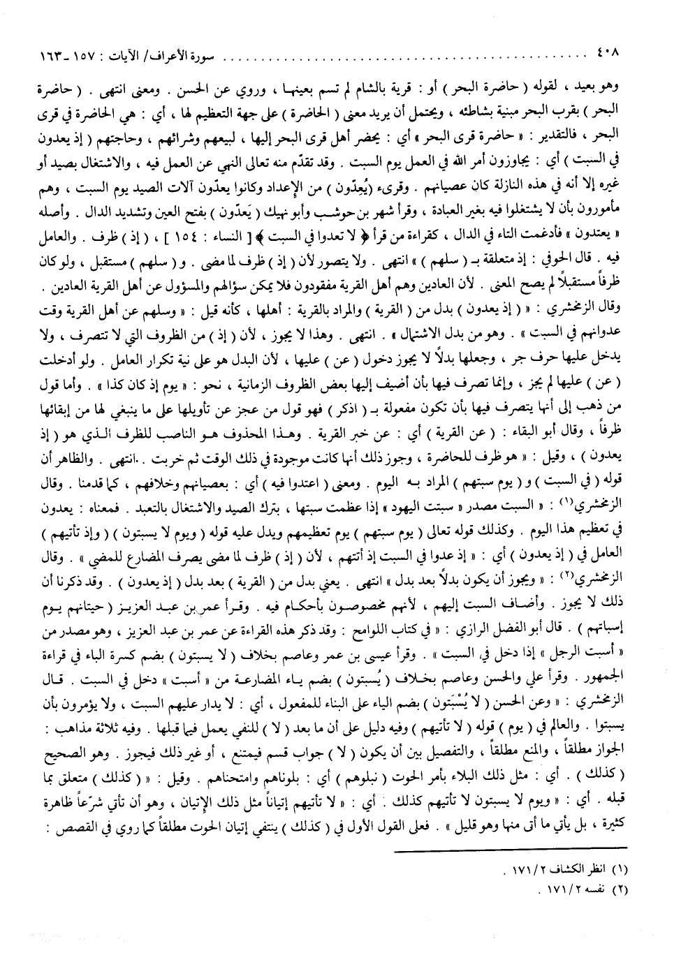 وهو بعيد لقوله حاضرة البحر أو قرية بالشام لم تسمَّ بعينها وروي عن الحسن : ومعنى انتهى حاضرة البحر بقرب البحر مبنية بشاطئه ويحتمل أن يريد معنى الحاضرة على جهة التعظيم لها أي هي الحاضرة في قرى البحر فالتقدير حاضرة قرى البحر أي يحضر أهل قرى البحر إليها لبيعهم وشرائهم وحاجتهم إذ يعدون في السبت أي يجاوزون أمر الله في العمل يوم السبت وقد تقدم منه تعالى النهي عن العمل فيه والاشتغال بصيد أو غيره إلا أنه في هذه النازلة كان عصيانهم ، وقرىء يعدّون من الإعداد وكانوا يعدّون آلات الصيد يوم السبت وهم مأمورون بأن لا يشتغلوا فيه بغير العبادة وقرأ شهر بن حوشب وأبو نهيك يعَدّون بفتح العين وتشديد الدال وأصله يعتدون فأدغمت التاء في الدال كقراءة من قرأ لا تعدوا في السبت إذ ظرف والعالم فيه . قال الحوفي : إذ متعلقة بسلهم انتهى ، ولا يتصور لأن إذ ظرف لما مضى وسلهم مستقبل ولو كان ظرفاً مستقبلاً لم يصحّ المعنى لأن العادين وهم أهل القرية مفقودون فلا يمكن سؤالهم والمسؤول عن أهل القرية العادين ، وقال الزمخشري : إذ يعدون بدل من القرية والمراد بالقرية أهلها كأنه قيل وسلهم عن أهل القرية وقت عدوانهم في السبت وهو من بدل الاشتمال انتهى ، وهذا لا يجوز لأن إذ من الظروف التي لا تتصرف ولا يدخل عليها حرف جر وجعلها بدلاً يجوز دخول عن عليها لأن البدل هو على نيّة تكرار العامل ولو أدخلت عن عليها لم يجز وإنما تصرف فيها بأن أضيف إليها بعض الظروف الزمانية نحو يوم إذ كان كذا وأما قول من ذهب إلى أنها يتصرّف فيها بأن تكون مفعولة باذكر فهو قول من عجز عن تأويلها على ما ينبغي لها من إبقائها ظرفاً ، وقال أبو البقاء عن القرية : أي عن خبر القرية وهذا المحذوف هو الناصب للظرف الذي هو إذ يعدون ، وقيل هو ظرف للحاضرة وجوّز ذلك أنها كانت موجودة في ذلك الوقت ثم خربت انتهى ، والظاهر أن قوله في السبت ويوم سبتهم المراد به اليوم ومعنى اعتدوا فيه أي بعصيانهم وخلافهم كما قدمنا ، وقال الزمخشري : السبت مصدر سبتت اليهود إذا عظمت سبتها بترك الصيد والاشتغال بالتعبّد فمعناه يعدون في تعظيم هذا اليوم وكذلك قوله تعالى يوم سبتهم يوم تعظيمهم ويدل عليه قوله ) وَيَوْمَ لاَ يَسْبِتُونَ وَإِذْ تَأْتِيَهُمُ ( العامل في إذ يعدون أي إذ عدوا في السبت إذ أتتهم لأنّ إذ ظرف لما مضى يصرف المضارع للمضي . وقال الزمخشري : ويجوز أن يكون بدلاً بعد بدل انتهى ، يعني بدلاً من القرية بعد بدل إذ يعدون وقد ذكرنا أن ذلك لا يجوز وأضاف السبت إليهم لأنهم مخصوصون بأحكام فيه ، وقرأ عمر بن عبد العزيز : حيتانهم يوم أسباتهم ، قال أبو الفضل الرازي في كتاب اللوامح وقد ذكر هذه القراءة عن عمر بن عبد العزيز : وهو مصدر من أسبت الرجل إذا دخل في السبت ، وقرأ عيسى بن عمر وعاصم بخلاف لا يسبتون بضمّ كسرة الباء في قراءة الجمهور ، وقرأ علي والحسن وعاصم بخلاف يسبتون بضم ياء المضارعة من أسبت دخل في السبت ، قال الزمخشري : وعن الحسن لا يسبتون بضم الياء على البناء للمفعول أي لا يدار عليهم السبت ولا يؤمرون بأن يسبتوا والعامل في يوم قوله لا تأتيهم وفيه دليل على أنّ ما بعد لا للنفي يعمل فيما قبلها وفيه ثلاثة مذاهب الجواز مطلقاً والمنع مطلقاً والتفصيل بين أن يكون لا جواب قسم فيمتنع أو غير ذلك فيجوز وهو الصحيح كذلك أي مثل ذلك البلاء بأمر الحوت نبلوهم أي بلوناهم وامتحناهم ، وقيل كذلك متعلق بما قبله أي ويوم لا يسبتون لا تأتيهم كذلك أي لا تأتيهم إتياناً مثل ذلك الإتيان وهو أن تأتي شرّعاً ظاهرة كثيرة بل يأتي ما أتى منها وهو قليل فعلى القول الأول في كذلك ينتفي إتيان الحوت مطلقاً ، كما روي في القصص