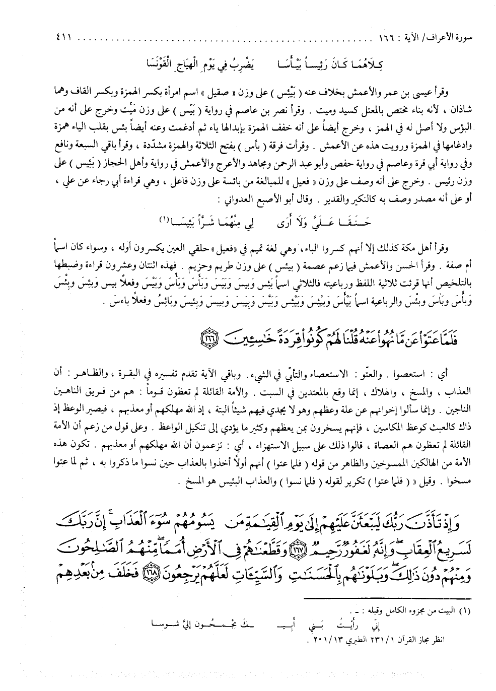 وقرأ عيسى بن عمر الأعمش بخلاف عنه ( بيئس ) على وزن ' صقيل ' اسم امرأة بكسر الهمزة وبكسر القاف وهما شاذان ، لأنه من بناء مختص بالمعتل كسيد وميت . وقرأ نصر بن عاصم في رواية ( بيس ) على وزن ميت وخرج على أنه من البؤس ولا أصل له في الهمز ، وخرج أيضاً على أنه خفف الهمزة بإبدالها ياء ثم أدغمت وعنه أيضاً بئس القلب الياء همزة وادغامها في الهمزة ورويت هذه عن الأعمش . وقرأت فرقة ( بأس ) بفتح الثلاثة والهمزة مشددة ، وقرأ باقي السبعة ونافع وفي رواية أبي قرة وعاصم في رواية حفص وأبو عبد الرحمن ومجاهد والأعرج والأعمش في رواية وأهل الحجاز ( بئيس ) على وزن رئيس . وخرج على أنه وصف على وزن ' فعيل ' للمبالغة من بائسة على وزن فاعل ، وهي قراءة أبي رجاء عن علي ، أو على أنه مصدر وصف به كالنكير والقدير ، وقال أبو الأصبع العدواني : حنقاً علي ولا أرى