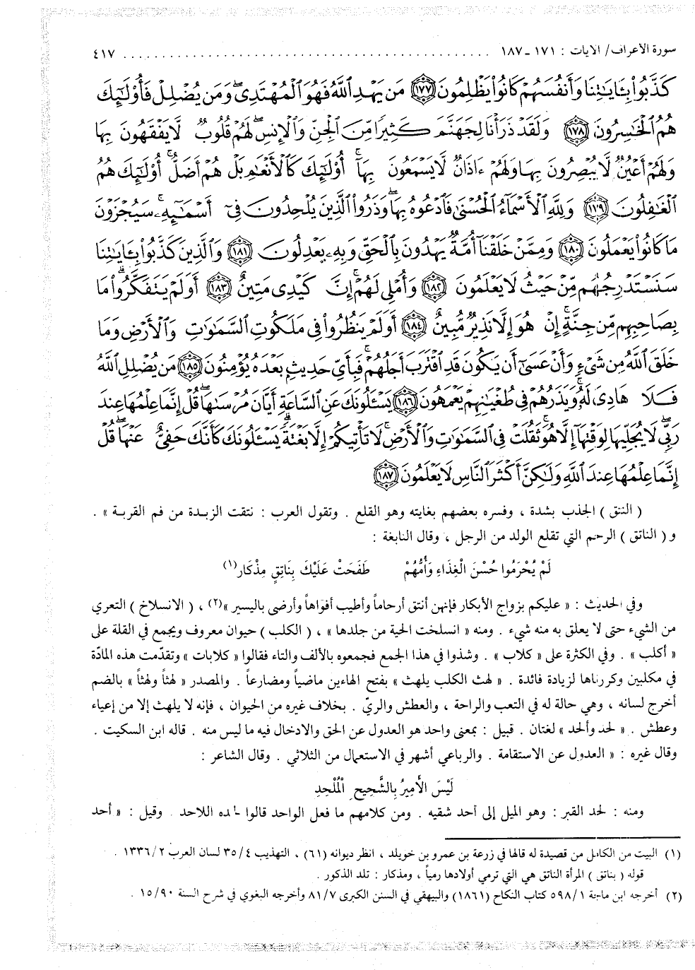 وفي الحديث عليكم بزواج الأبكار فإنهن انتق أرحاماً وأطيب أفواهاً وأرضى باليسير . الانسلاخ : التعري من الشيء حتى لا يعلق به منه شيء ومنه انسلخت الحية من جلدها . الكلب حيوان معروف ويجمع في القلة على أكلب وفي الكثرة على كلاب وشذوا في هذا الجمع فجمعوه بالألف والتاء فقالوا كلابات ، وتقدّمت هذه المادة في مكلبين وكرّرناها لزيادة فائدة ، لهث الكلب يلهث بفتح الهاءين ماضياً ومضارعاً والمصدر لهثاً ولهثاً بالضم أخرج لسانه وهي حالة له في التعب والراحة والعطش والريّ بخلاف غيره من الحيوان فإنه لا يلهث إلا من إعياء وعط 5 ، لحد وألحد لغتان قيل بمعنى واحد هو العدول عن الحقّ والإدخال فيه ما ليس منه قاله ابن السكيت ، وقال غيره : العدول عن الاستقامة والرّباعي أشهر في الاستعمال من الثلاثي وقال الشاعر :