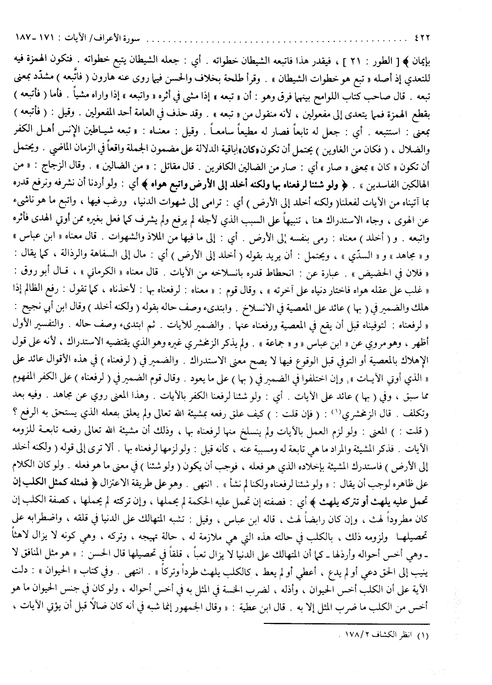 ( وَلَوْ شِئْنَا لَرَفَعْنَاهُ بِهَا وَلَاكِنَّهُ أَخْلَدَ إِلَى الاْرْضِ وَاتَّبَعَ هَوَاهُ ). أي ولو أردنا أن نشرفه ونرفع قدره بما آتيناه من الآيات لفعلنا ولكنه أخلد إلى الأرض أي ترامى إلى شهوات الدنيا ورغب فيها واتبع ما هو ناشىء عن الهوى وجاء الاستدراك هنا تنبيهاً على السبب الذي لأجله لم يرفع ولم يشرف كما فعل بغيره ممن أوتي الهدى فآثره وأتبعه وأخلد معناه رمى بنفسه إلى الأرض أي إلى ما فيها من الملاذ والشهوات قال معناه ابن عباس ومجاهد والسدّي ، ويحتمل أن يريد بقوله أخلد إلى الأرض أي مال إلى السفاهة والرذالة كما يقال : فلان في الحضيض عبارة عن انحطاط قدره بانسلاخه من الآيات قال معناه الكرماني . قال أبو روق : غلب على عقله هواه فاختار دنياه على آخرته ، وقال قوم : معناه لرفعناه بها لأخذناه كما تقول رفع الظالم إذا هلك والضمير في بها عائد على المعصية في الانسلاخ وابتدىء وصف حاله بقوله ولكنه أخلد ، وقال ابن أبي نجيح لرفعناه لتوفيناه قبل أن يقع في المعصية ورفعناه عنها والضمير للآيات ثم ابتدىء وصف حاله والتفسير الأول أظهر وهو مرويّ عن ابن عباس وجماعة ولم يذكر الزمخشري غيره وهو الذي يقتضيه الاستدراك لأنه على قول الإهلاك بالمعصية أو التوفي قبل الوقوع فيها لا يصحّ معنى الاستدراك والضمير في لرفعناه في هذه الأقوال عائد على الذي أوتي الآيات وإن اختلفوا في الضمير في بها على ما يعود وقال قوم الضمير في لرفعناه على الكفر المفهوم مما سبق وفي بها عائد على الآيات أي ولو شئنا لرفعنا الكفر بالآيات وهذا المعنى روي عن مجاهد وفيه بعد وتكلّف ، قال الزمخشري : ( فإن قلت ) : كيف علق رفعه بمشيئة الله تعالى ولم يعلق بفعله الذي يستحق به الرفع ، ( قلت ) : المعنى ولو لزم العمل بالآيات ولم ينسلخ منها لرفعناه بها وذلك أن مشيئة الله تعالى رفعه تابعة للزومه الآيات فذكر المشيئة والمراد ما هي تابعة له ومسببة عنه كأنه قيل ولو لزمها لرفعناه بها ألا ترى إلى قوله ولكنه أخلد إلى الأرض فاستدرك المشيئة بإخلاده الذي هو فعله فوجب أن يكون ولو شئنا في معنى ما هو فعله ولو كان الكلام على ظاهره لوجب أن يقال : ولو شئنا لرفعناه ولكنا لم نشأ انتهى ، وهو على طريقة الاعتزال .