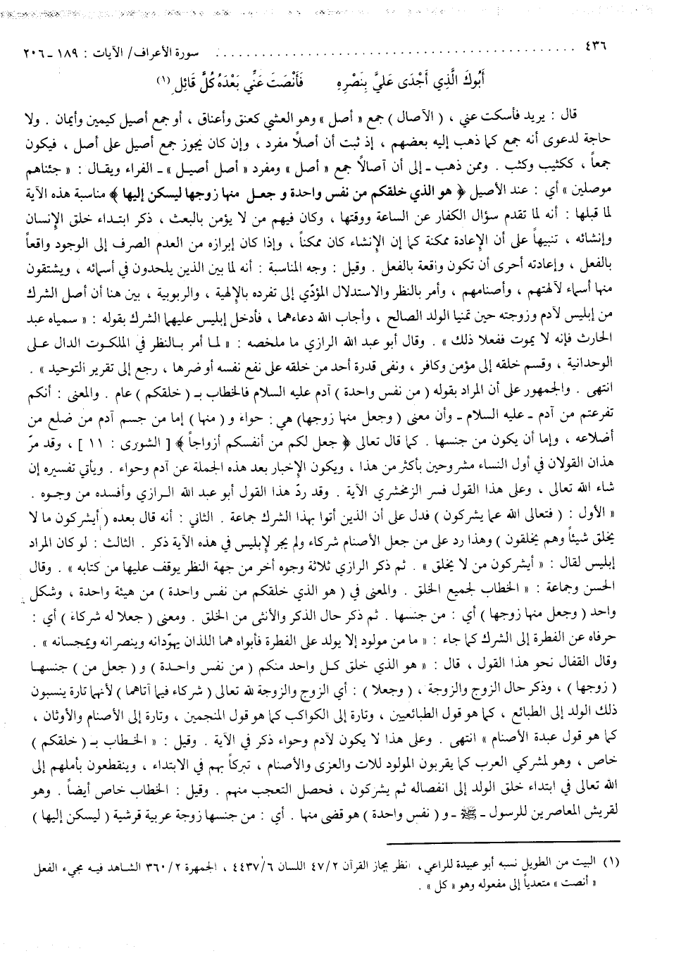 ( هُوَ الَّذِى خَلَقَكُمْ مّن نَّفْسٍ واحِدَةٍ وَجَعَلَ مِنْهَا زَوْجَهَا لِيَسْكُنَ إِلَيْهَا ). مناسبة هذه الآية لما قبلها أنه لما تقدم سؤال الكفار عن الساعة ووقتها وكان فيهم من لا يؤمن بالبعث ذكر ابتداء خلق الإنسان وإنشائه تنبيهاً على أن الإعادة ممكنة ، كما أن الإنشاء كان ممكناً وإذا كان إبرازه من العدم الصرف إلى الوجود واقعاً بالفعل وإعادته أحرى أن تكون واقعة بالفعل ، وقيل : وجه المناسبة أنه لما بين الذين يلحدون في أسمائه ويشتقون منها أسماء لآلهتهم وأصنامهم وأمر بالنظر والاستدلال المؤدي إلى تفرده بالإلهية والربوبية بين هنا أن أصل الشرك من إبليس لآدم وزوجته حين تمنيا الولد الصالح وأجاب الله دعاءهما فأدخل إبليس عليهما الشرك بقوله سمياه عبد الحرث فإنه لا يموت ففعلا ذلك ، وقال أبو عبد الله الرازي ما ملخصه لما أمر بالنظر في الملكوت الدال على الوحدانية وقسم خلقه إلى مؤمن وكافر ونفى قدرة أحد من خلقه على نفع نفسه أو ضرّها رجع إلى تقرير التوحيد انتهى ، والجمهور على أن المراد بقوله من نفس واحدة آدم عليه السلام فالخطاب بخلقكم عام والمعنى أنكم تفرعتم من آدم عليه السلام وأن معنى وجعل منها زوجها هي حواء ومنها إما من جسم آدم من ضلع من أضلاعه وإما أن يكون من جنسها كما قال تعالى ) جَعَلَ لَكُمْ مّنْ أَنفُسِكُمْ أَزْوَاجًا ( وقد مرّ هذان القولان في أول النساء مشروحين بأكثر من هذا ويكون الإخبار بعد هذه الجملة عن آدم وحواء ويأتي تفسيره إن شاء الله تعالى ، وعلى هذا القول فسّر الزمخشري الآية وقد رد هذا القول أبو عبد الله الرازي وأفسده من وجوه . الأول فتعالى الله عما يشركون فدل على أن الذين أتوا بهذا الشرك جماعة . الثاني أنه قال بعده أيشركون ما لا يخلق شيئاً وهم يخلقون وهذا ردّ على من جعل الأصنام شركاء ولم يجر لإبليس في هذه الآية ذكر ، الثالث لو كان المراد إبليس لقال أيشركون من لا يخلق ثم ذكر الرازي ثلاثة وجوه أخر من جهة النظر يوقف عليها من كتابه ، وقال الحسن وجماعة الخطاب لجميع الخلق والمعنى في هو الذي خلقكم من نفس واحدة من هيئة واحدة وشكل واحد وجعل منها زوجها أي من جنسها ثم ذكر حال الذكر والأنثى من الخلق ومعنى جعلا له شركاء أي حرفاه عن الفطرة إلى الشرك كما جاء : ( ما من مولود إلا يولد على الفطرة فأبواه هما اللذان يهوّدانه وينصرانه ويمجسانه ) . وقال القفال نحو هذا القول قال هو الذي خلق كل واحد منكم من نفس واحدة وجعل من جنسها زوجها وذكر حال الزوج والزوجة وجعلا أي الزوج والزوجة ، لله تعالى شركاء فيما آتاهما لأنهما تارة ينسبون ذلك الولد إلى الطبائع كما هو قول الطبائعيين وتارة إلى الكواكب كما هو قول المنجّمين وتارة إلى الأصنام والأوثان كما هو قول عبدة الأصنام انتهى ، وعلى هذا لا يكون لآدم وحوّاء ذكر في الآية ، وقيل الخطاب بخلقكم خاص وهو لمشركي العرب كما يقرّبون المولود للات والعزى والأصنام تبركاً بهم في الابتداء وينقطعون بأملهم إلى الله تعالى في ابتداء خلق الولد إلى انفصاله ثم يشركون فحصل التعجب منهم ، وقيل : الخطاب خاص أيضاً وهو لقريش المعاصرين للرسول ( صلى الله عليه وسلم ) ) ونفس واحدة هو قضى منها أي من جنسها زوجة عربية قرشية ليسكن إليها
