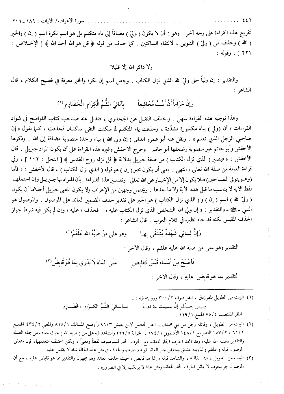 تخريج هذه القراءة على وجه آخر وهو أن لا يكون ولي مضافاً إلى ياء متكلم بل هو اسم نكرة اسم إنّ والخبر الله وحذف من وليّ التنوين لالتقاء الساكنين كما حذف من قوله قل هو الله أحد وقوله ولا ذاكر الله إلا قليلاً والتقدير أنّ وليًّا حقّ وليّ الله الذي نزل الكتاب وجعل اسم إنّ نكرة والخبر معرفة في فصيح الكلام . قال الشاعر : وإن حراماً أن أسب مجاشعا