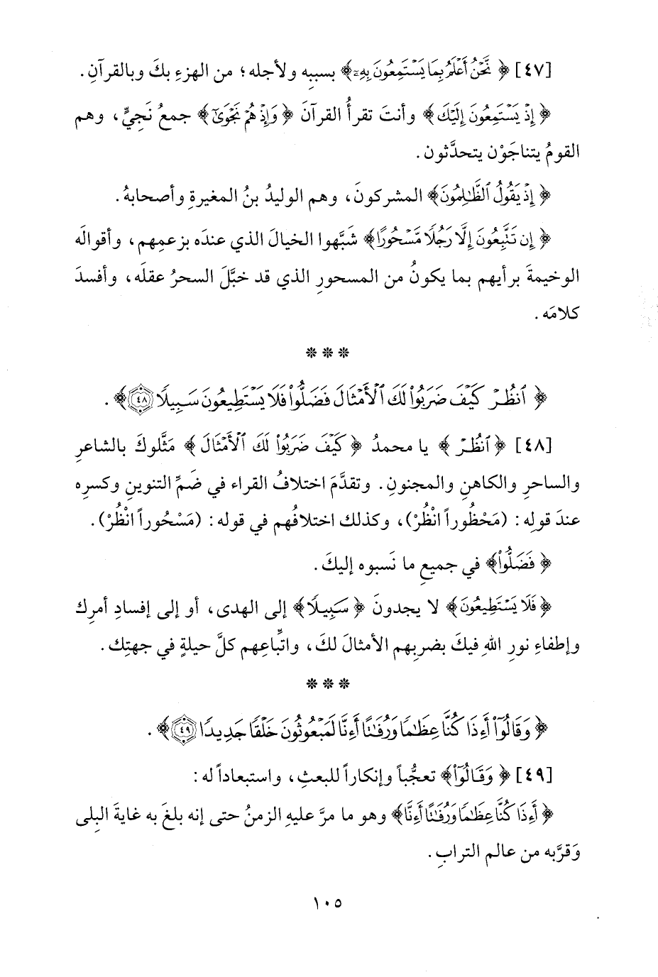 [48] {انْظُرْ} يا محمدُ {كَيْفَ ضَرَبُوا لَكَ الْأَمْثَالَ} مَثَّلوكَ بالشاعرِ والساحرِ والكاهنِ والمجنونِ. وتقدَّمَ اختلافُ القراء في ضَمِّ التنوينِ وكسرِه عندَ قوله: (مَحْظُورًا انْظُرْ)، وكذلك اختلافُهم في قوله: (مَسْحُورًا انْظُرْ).