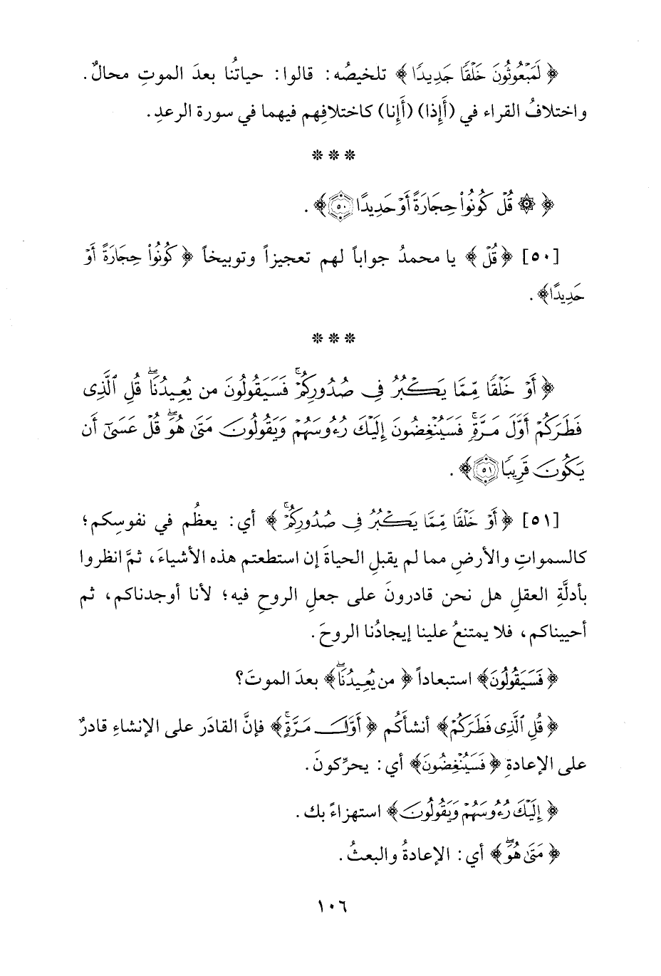 [51] {أَوْ خَلْقًا مِمَّا يَكْبُرُ فِي صُدُورِكُمْ} أي: يعظُم في نفوسِكم؛ كالسمواتِ والأرضِ مما لم يقبلِ الحياةَ إن استطعتم هذه الأشياءَ، ثمَّ انظروا بأدلَّةِ العقلِ هل نحن قادرونَ على جعلِ الروحِ فيه؛ لأنا أوجدناكم، ثم أحييناكم، فلا يمتنعُ علينا إيجادُنا الروحَ.