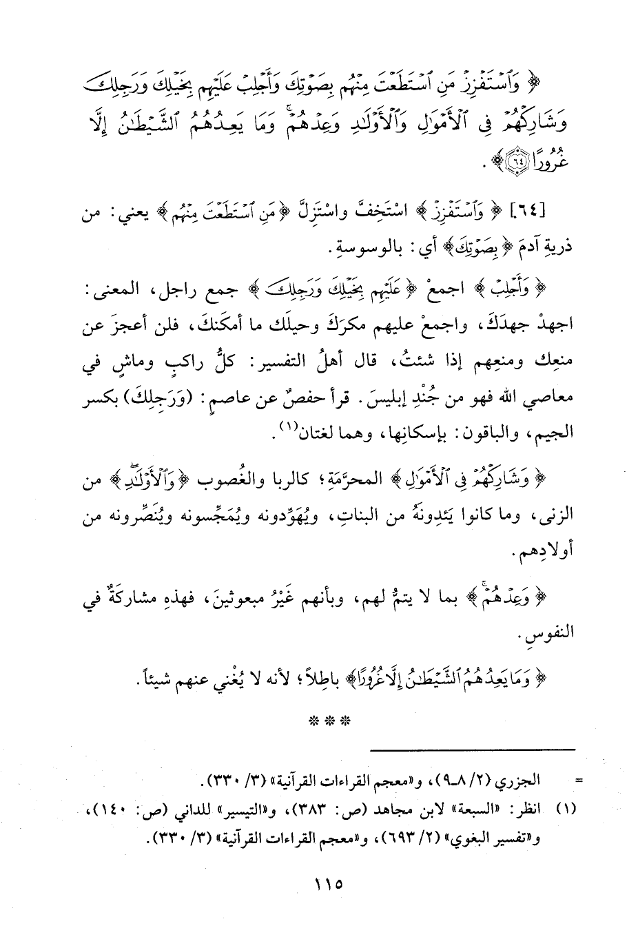 {وَاسْتَفْزِزْ مَنِ اسْتَطَعْتَ مِنْهُمْ بِصَوْتِكَ وَأَجْلِبْ عَلَيْهِمْ بِخَيْلِكَ وَرَجِلِكَ وَشَارِكْهُمْ فِي الْأَمْوَالِ وَالْأَوْلَادِ وَعِدْهُمْ وَمَا يَعِدُهُمُ الشَّيْطَانُ إِلَّا غُرُورًا (64)}.
