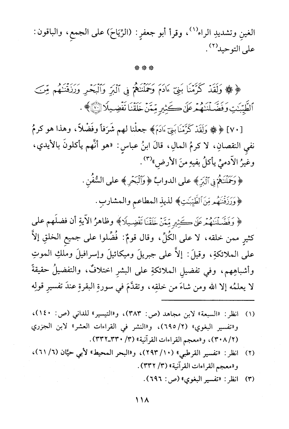 [70] {وَلَقَدْ كَرَّمْنَا بَنِي آدَمَ} جعلْنا لهم شَرَفًا وفَضْلًا، وهذا هو كرمُ نفيِ النقصانِ، لا كرمُ المالِ، قالَ ابنُ عباسٍ: "هو أنَّهم يأكلونَ بالأيدي، وغيرُ الآدميِّ يأكلُ بفيهِ منَ الأرضِ" (¬3).