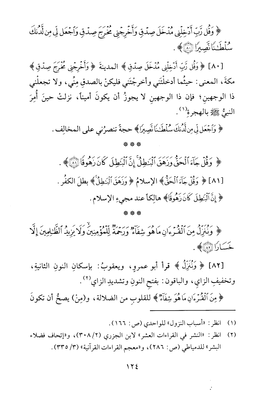 [82] {وَنُنَزِّلُ} قرأ أبو عمروٍ، ويعقوبُ: بإسكانِ النونِ الثانيةِ، وتخفيفِ الزايِ، والباقون: بفتحِ النونِ وتشديدِ الزاي (¬2).