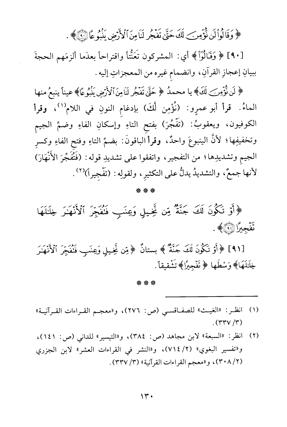 [91] {أَوْ تَكُونَ لَكَ جَنَّةٌ} بستانٌ {مِنْ نَخِيلٍ وَعِنَبٍ فَتُفَجِّرَ الْأَنْهَارَ خِلَالَهَا} وَسْطَها {تَفْجِيرًا} تشقيقًا.