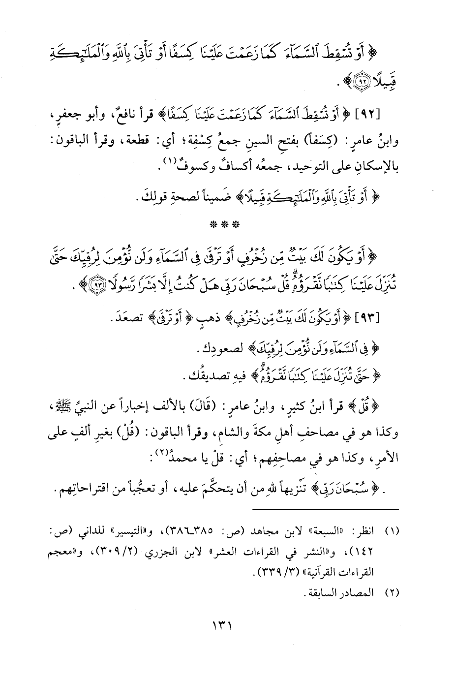 [92] {أَوْ تُسْقِطَ السَّمَاءَ كَمَا زَعَمْتَ عَلَيْنَا كِسَفًا} قرأ نافع، وأبو جعفرٍ، وابنُ عامرٍ: (كِسَفًا) بفتحِ السينِ جمعُ كِسْفِة؛ أي: قطعة، وقرأ الباقون: بالإسكانِ على التوحيد، جمعُه أكسافٌ وكسوفٌ (¬1).
