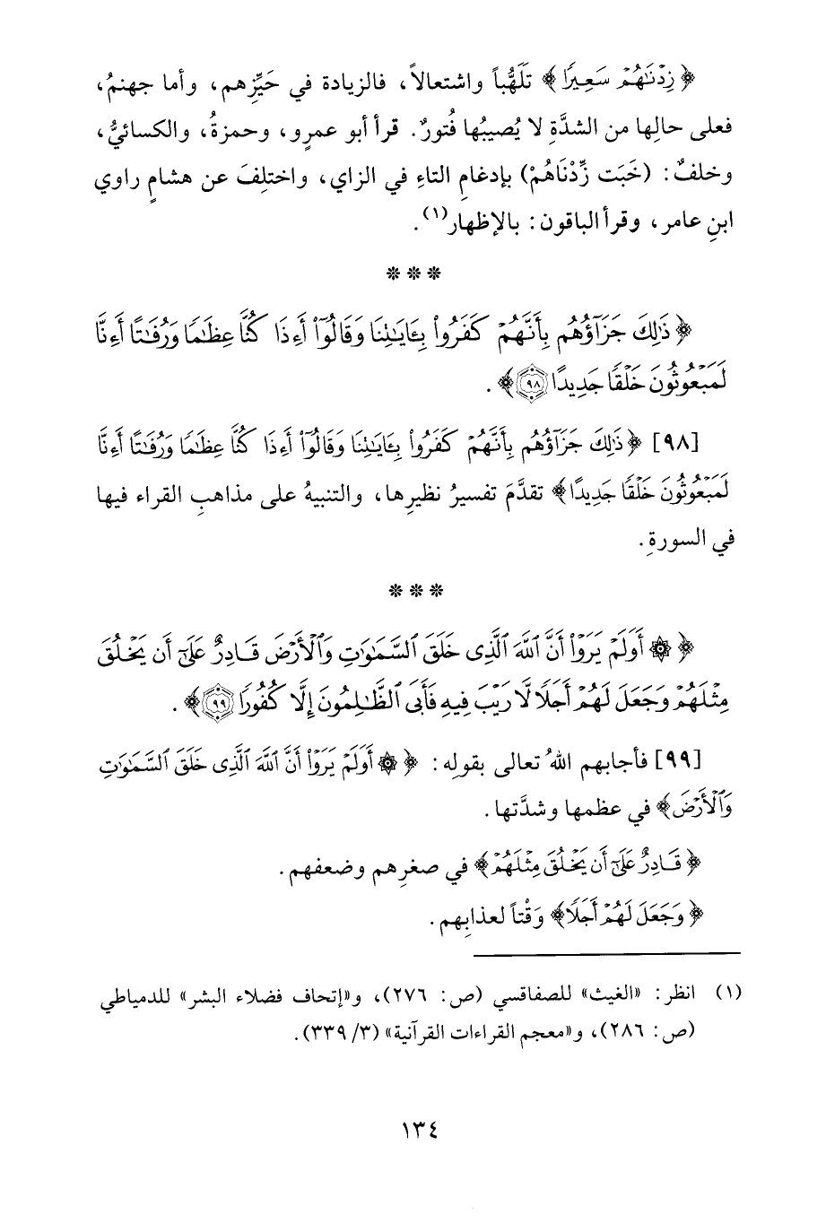 [98] {ذَلِكَ جَزَاؤُهُمْ بِأَنَّهُمْ كَفَرُوا بِآيَاتِنَا وَقَالُوا أَإِذَا كُنَّا عِظَامًا وَرُفَاتًا أَإِنَّا لَمَبْعُوثُونَ خَلْقًا جَدِيدًا} تقدَّمَ تفسيرُ نظيرِها، والتنبيهُ على مذاهبِ القراء فيها في السورةِ.