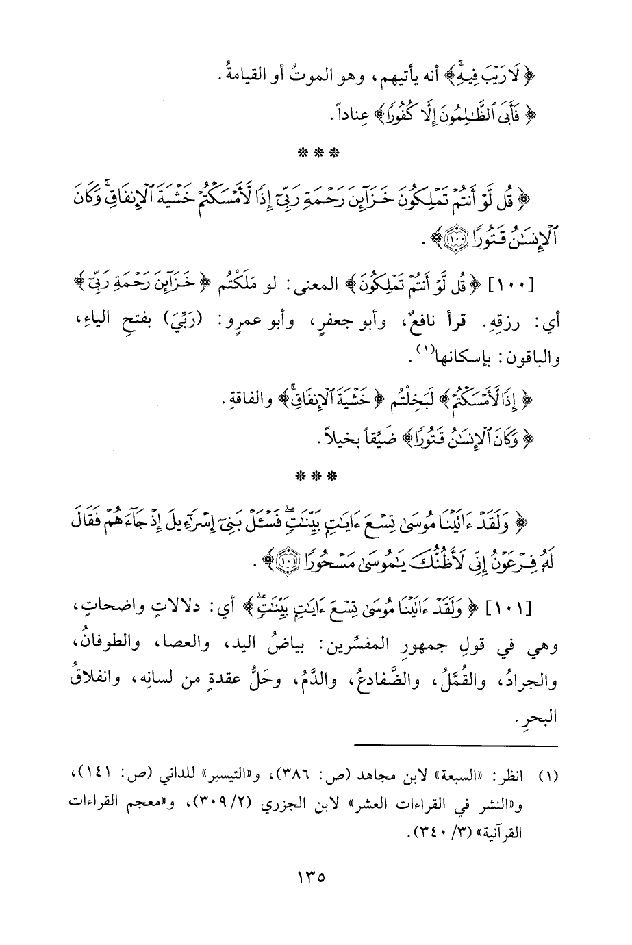 [100] {قُلْ لَوْ أَنْتُمْ تَمْلِكُونَ} المعنى: لو مَلَكْتُم {خَزَائِنَ رَحْمَةِ رَبِّي} أي: رزقِهِ. قرأ نافعٌ، وأبو جعفرٍ، وأبو عمرٍو: (رَبِّيَ) بفتحِ الياءِ، والباقون: بإسكانها (¬1).