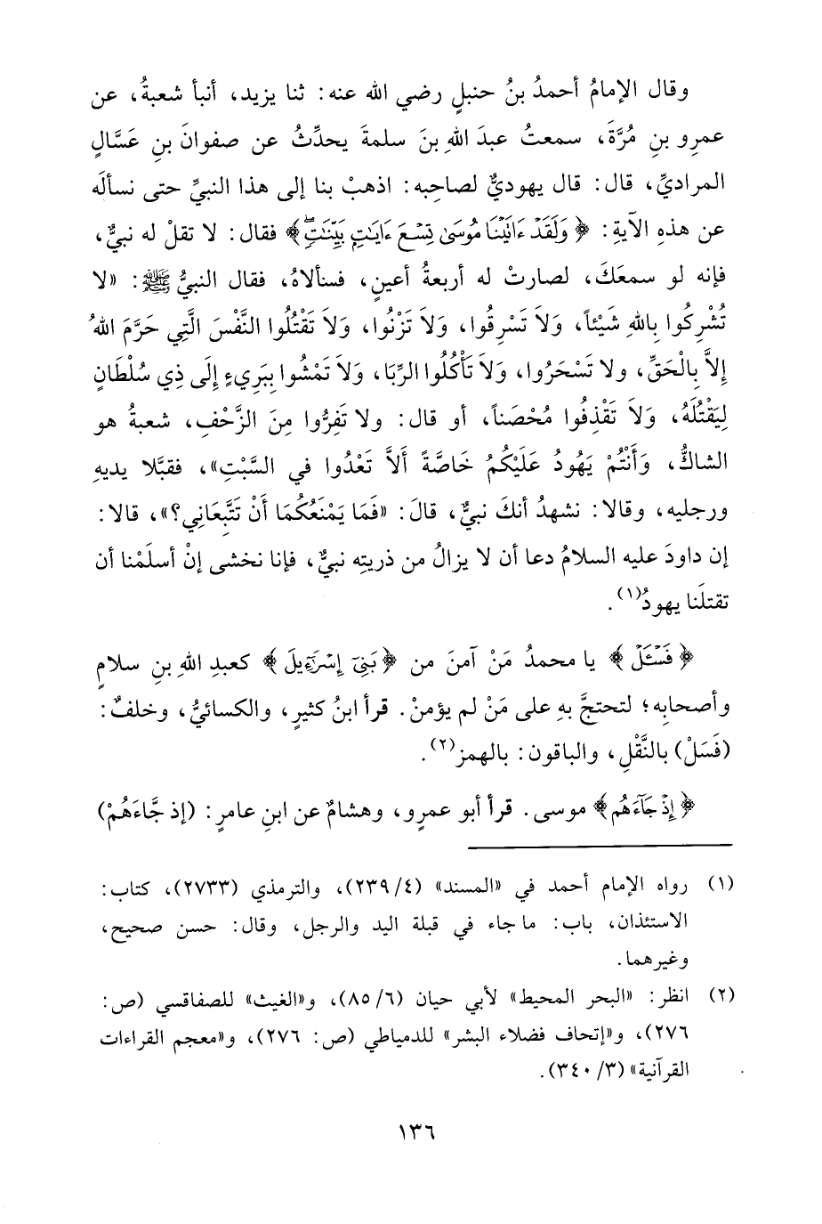 وقال الإمامُ أحمدُ بنُ حنبلٍ رضي الله عنه: ثنا يزيد، أنبأ شعبةُ، عن عمرِو بنِ مُرَّةَ، سمعتُ عبدَ اللهِ بنَ سلمةَ يحدِّثُ عن صفوانَ بنِ عَسَّالٍ المراديِّ، قال: قال يهوديٌّ لصاحِبه: اذهبْ بنا إلى هذا النبيِّ حتى نسألَه عن هذهِ الآيةِ: {وَلَقَدْ آتَيْنَا مُوسَى تِسْعَ آيَاتٍ بَيِّنَاتٍ} فقال: لا تقلْ له نبيٌّ، فإنه لو سمعَكَ، لصارتْ له أربعةُ أعينٍ، فسنألاهُ، فقال النبيُّ - صلى الله عليه وسلم -: "لا تُشْرِكُوا بِاللهِ شَيْئًا، وَلاَ تَسْرِقُوا، وَلاَ تَزْنُوا، وَلاَ تَقْتُلُوا النَّفْسَ الَّتِي حَرَّمَ اللهُ إِلَّا بِالْحَقِّ، ولا تَسْحَرُوا، وَلاَ تأْكُلُوا الرِّبَا، وَلاَ تَمْشُوا بِبَرِيءٍ إِلَى ذِي سُلْطَانٍ لِيَقتُلَهُ، وَلاَ تَقْذِفُوا مُحْصنًا، أو قال: ولا تَفِرُّوا مِنَ الزَّحْفِ، شعبةُ هو الشاكُّ، وَأَنْتُمْ يَهُودُ عَلَيْكُمُ خَاصَّةً أَلَّا تَعْدُوا في السَّبْتِ"، فقبَّلا يديهِ ورجليه، وقالا: نشهدُ أنكَ نبيٌّ، قالَ: "فَمَا يَمْنَعُكُمَا أَنْ تَتَّبِعَانِي؟ "، قالا: إن داودَ عليه السلامُ دعا أن لا يزالُ من ذريتِه نبيٌّ، فإنا نخشى إنْ أسلَمْنا أن تقتلَنا يهودُ (¬1).