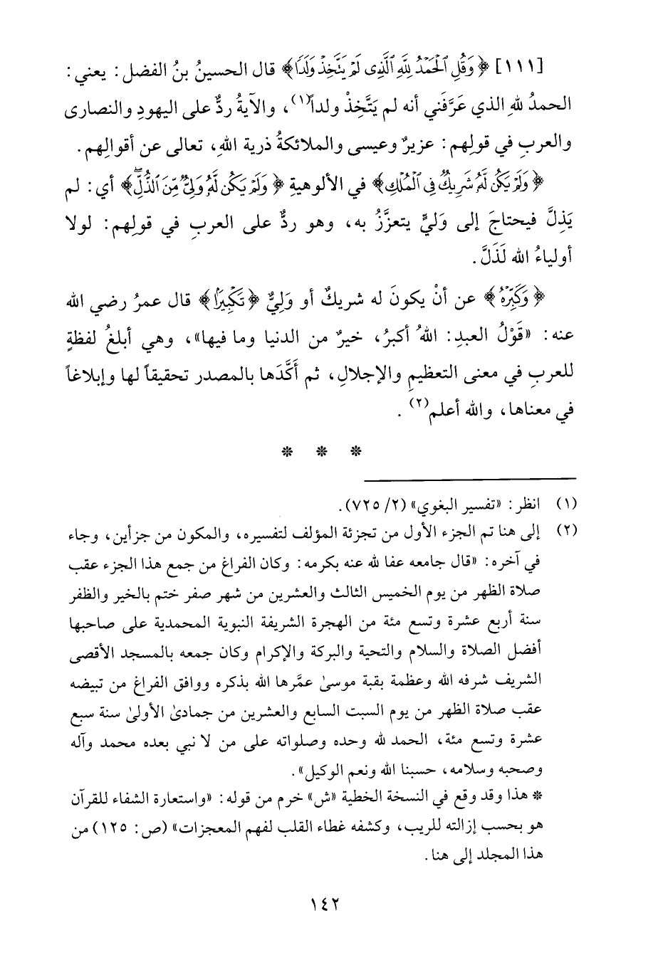 [111] {وَقُلِ الْحَمْدُ لِلَّهِ الَّذِي لَمْ يَتَّخِذْ وَلَدًا} قال الحسينُ بنُ الفضل: يعني: الحمدُ للهِ الذي عَرَّفَني أنه لم يَتَّخِذْ ولدًا (¬1)، والآيةُ ردٌّ على اليهودِ والنصارى والعربِ في قولهم: عزيرٌ وعيسى والملائكةُ ذرية اللهِ، تعالى عن أقوالِهم.