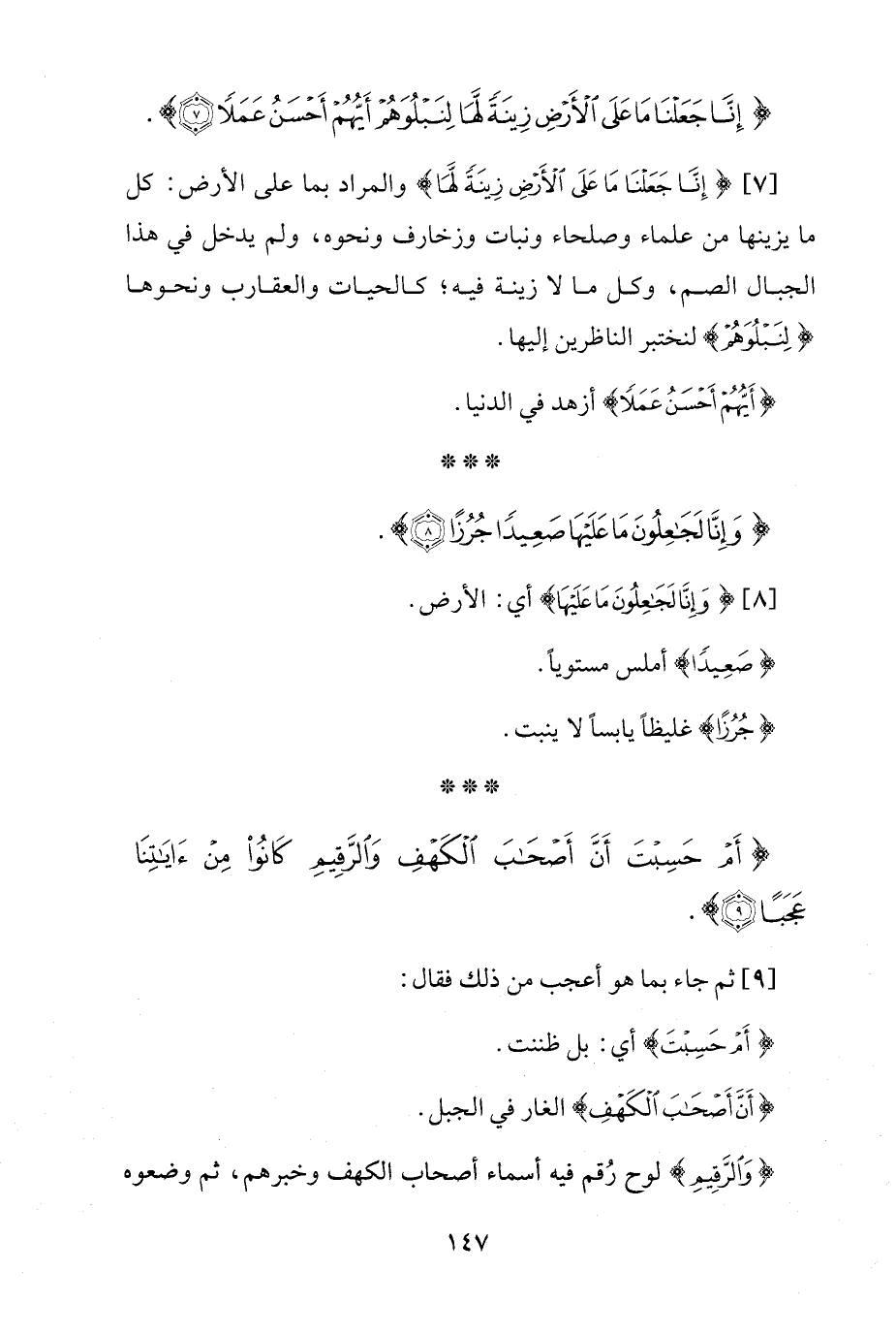 [7] {إِنَّا جَعَلْنَا مَا عَلَى الْأَرْضِ زِينَةً لَهَا} والمراد بما على الأرض: كل ما يزينها من علماء وصلحاء ونبات وزخارف ونحوه، ولم يدخل في هذا الجبال الصم، وكل ما لا زينة فيه؛ كالحيات والعقارب ونحوها {لِنَبْلُوَهُمْ} لنختبر الناظرين إليها.