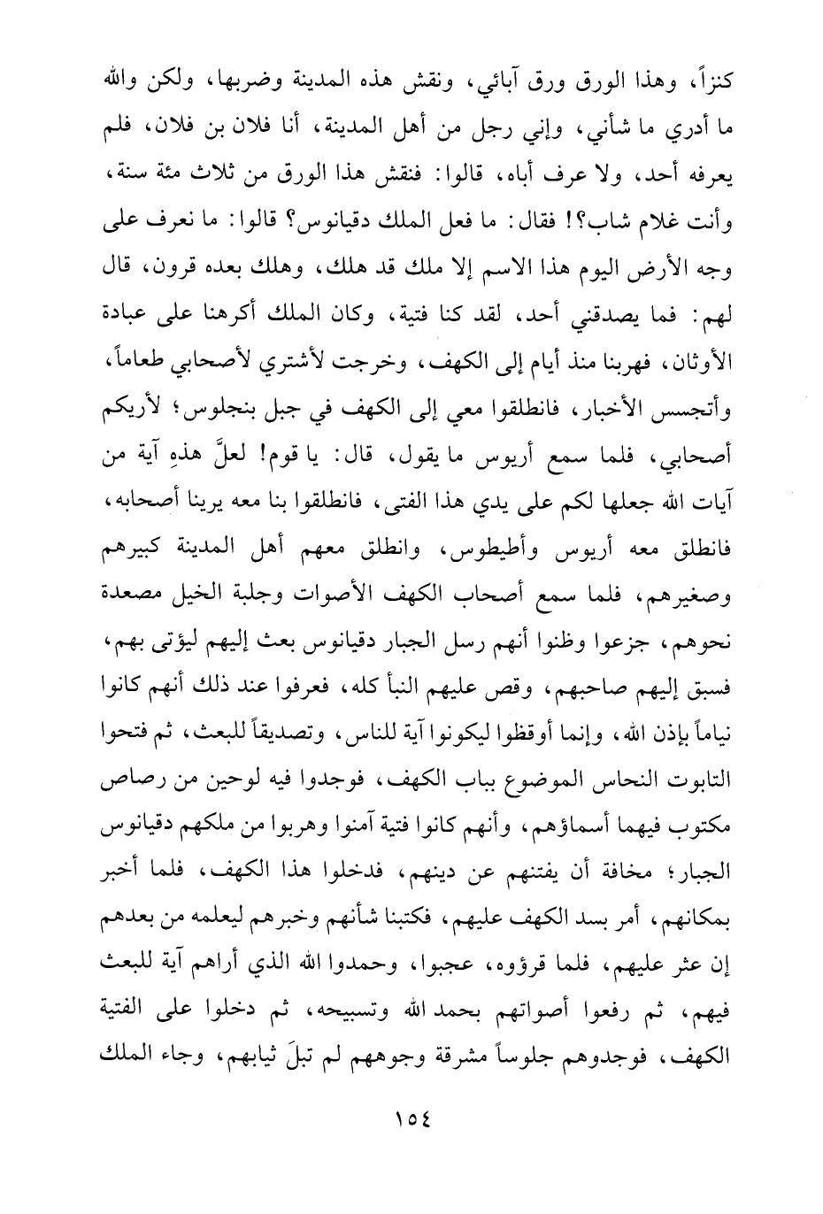 كنزًا، وهذا الورق ورق آبائي، ونقش هذه المدينة وضربها، ولكن والله ما أدري ما شأني، وإني رجل من أهل المدينة، أنا فلان بن فلان، فلم يعرفه أحد، ولا عرف أباه، قالوا: فنقش هذا الورق من ثلاث مئة سنة، وأنت غلام شاب؟! فقال: ما فعل الملك دقيانوس؟ قالوا: ما نعرف على وجه الأرض اليوم هذا الاسم إلا ملك قد هلك، وهلك بعده قرون، قال لهم: فما يصدقني أحد، لقد كنا فتية، وكان الملك أكرهنا على عبادة الأوثان، فهربنا منذ أيام إلى الكهف، وخرجت لأشتري لأصحابي طعامًا، وأتجسس الأخبار، فانطلقوا معي إلى الكهف في جبل بنجلوس؛ لأريكم أصحابي، فلما سمع أريوس ما يقول، قال: يا قوم! لعلَّ هذهِ آية من آيات الله جعلها لكم على يدي هذا الفتى، فانطلقوا بنا معه يرينا أصحابه، فانطلق معه أريوس وأطيطوس، وانطلق معهم أهل المدينة كبيرهم وصغيرهم، فلما سمع أصحاب الكهف الأصوات وجلبة الخيل مصعدة نحوهم، جزعوا وظنوا أنهم رسل الجبار دقيانوس بعث إليهم ليؤتى بهم، فسبق إليهم صاحبهم، وقص عليهم النبأ كله، فعرفوا عند ذلك أنهم كانوا نيامًا بإذن الله، وإنما أوقظوا ليكونوا آية للناس، وتصديقًا للبعث، ثم فتحوا التابوت النحاس الموضوع بباب الكهف، فوجدوا فيه لوحين من رصاص مكتوب فيهما أسماؤهم، وأنهم كانوا فتية آمنوا وهربوا من ملكهم دقيانوس الجبار؛ مخافة أن يفتنهم عن دينهم، فدخلوا هذا الكهف، فلما أخبر بمكانهم، أمر بسد الكهف عليهم، فكتبنا شأنهم وخبرهم ليعلمه من بعدهم إن عثر عليهم، فلما قرؤوه، عجبوا، وحمدوا الله الذي أراهم آية للبعث فيهم، ثم رفعوا أصواتهم بحمد الله وتسبيحه، ثم دخلوا على الفتية الكهف، فوجدوهم جلوسًا مشرقة وجوههم لم تبلَ ثيابهم، وجاء الملك