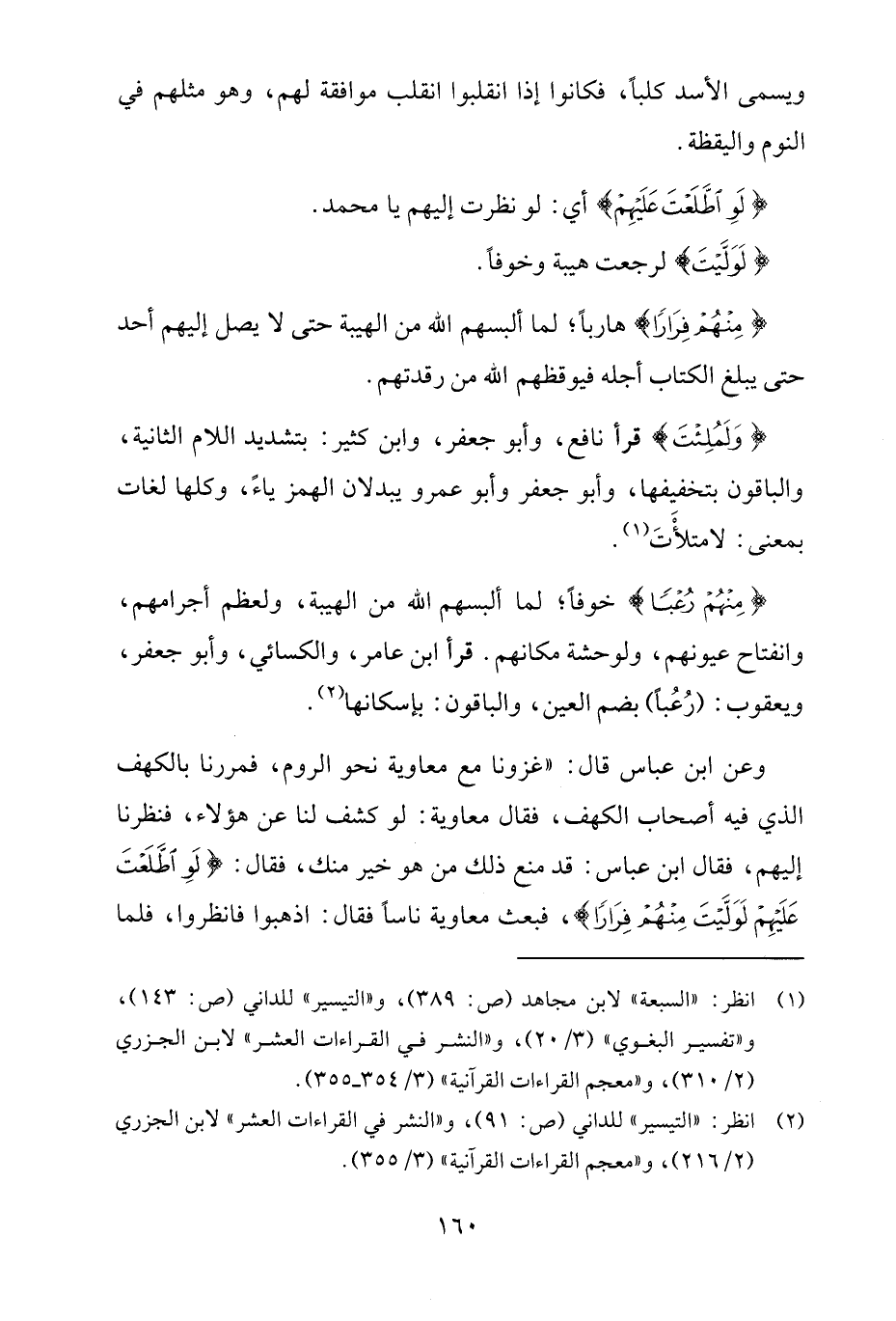 {مِنْهُمْ رُعْبًا} خوفًا؛ لما ألبسهم الله من الهيبة، ولعظم أجرامهم، وانفتاح عيونهم، ولوحشة مكانهم. قرأ ابن عامر، والكسائي، وأبو جعفر، ويعقوب: (رُعُبًا) بضم العين، والباقون: بإسكانها (¬2).