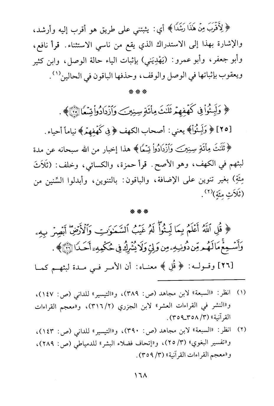 {ثَلَاثَ مِائَةٍ سِنِينَ وَازْدَادُوا تِسْعًا} هذا إخبار من الله سبحانه عن مدة لبثهم في الكهف، وهو الأصح. قرأ حمزة، والكسائي، وخلف: (ثَلاَثَ مِئَةِ) بغير تنوين على الإضافة، والباقون: بالتنوين، وأبدلوا السِّنين من (ثَلاَثِ مِئَةٍ) (¬2).