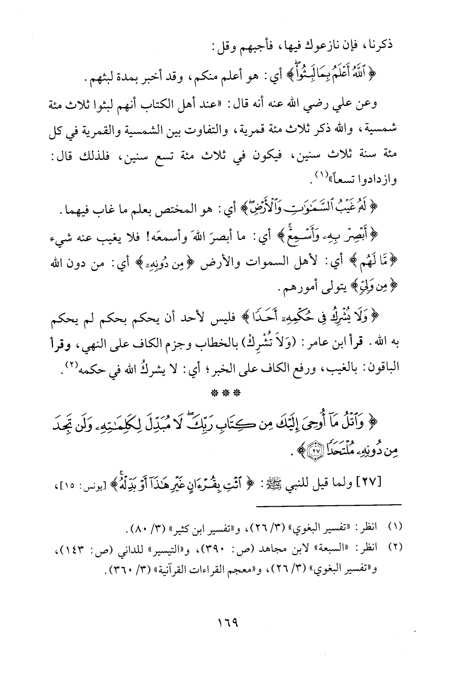 {وَاتْلُ مَا أُوحِيَ إِلَيْكَ مِنْ كِتَابِ رَبِّكَ لَا مُبَدِّلَ لِكَلِمَاتِهِ وَلَنْ تَجِدَ مِنْ دُونِهِ مُلْتَحَدًا (27)}.