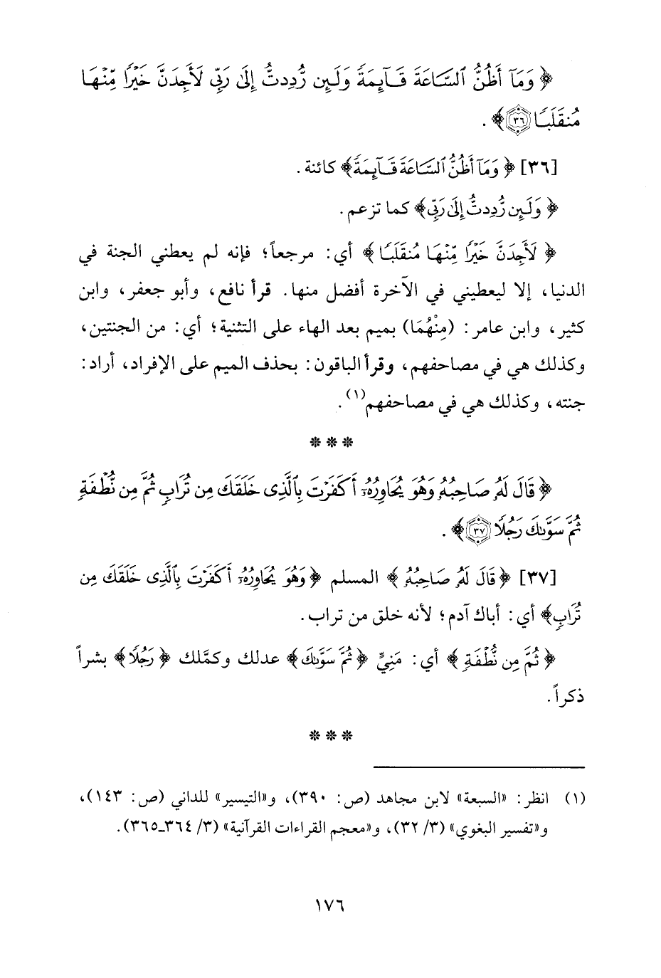 {لأَجِدَنَّ خَيْرًا مِنْهَا مُنْقَلَبًا} أي: مرجعًا؛ فإنه لم يعطني الجنة في الدنيا، إلا ليعطيني في الآخرة أفضل منها. قرأ نافع، وأبو جعفر، وابن كثير، وابن عامر: (مِنْهُمَا) بميم بعد الهاء على التثنية؛ أي: من الجنتين، وكذلك هي في مصاحفهم، وقرأ الباقون: بحذف الميم على الإفراد، أراد: جنته، وكذلك هي في مصاحفهم (¬1).