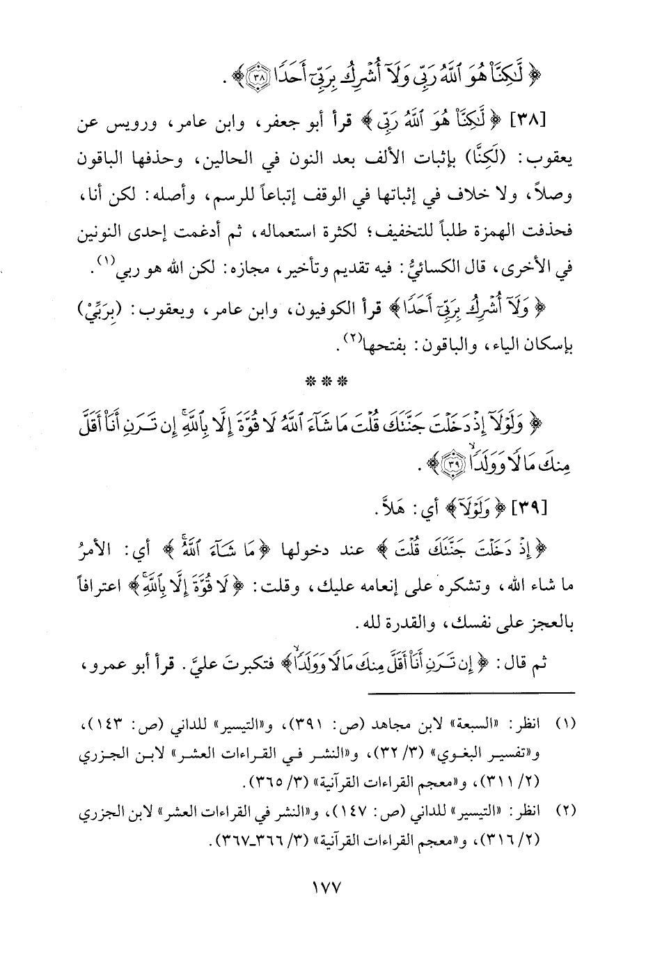 [38] {لَكِنَّا هُوَ اللَّهُ رَبِّي} قرأ أبو جعفر، وابن عامر، ورويس عن يعقوب: (لَكِنَّا) بإثبات الألف بعد النون في الحالين، وحذفها الباقون وصلًا، ولا خلاف في إثباتها في الوقف إتباعًا للرسم، وأصله: لكن أنا، فحذفت الهمزة طلبًا للتخفيف؛ لكثرة استعماله، ثم أدغمت إحدى النونين في الأخرى، قال الكسائيُّ: فيه تقديم وتأخير، مجازه: لكن الله هو ربي (¬1).
