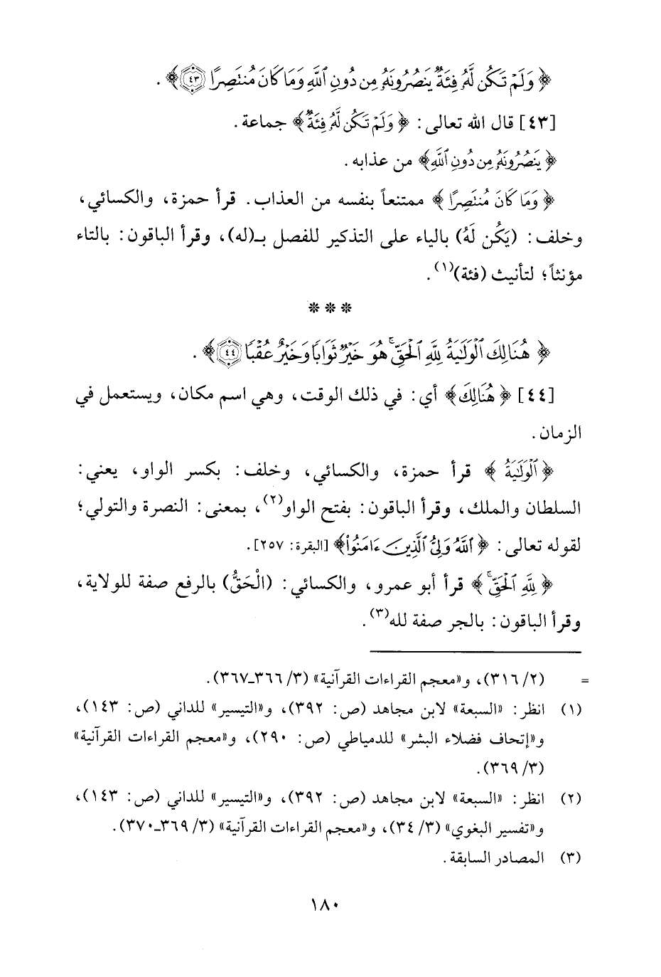 {لِلَّهِ الْحَقِّ} قرأ أبو عمرو، والكسائي: (الْحَقُّ) بالرفع صفة للولاية، وقرأ الباقون: بالجر صفة لله (¬3).