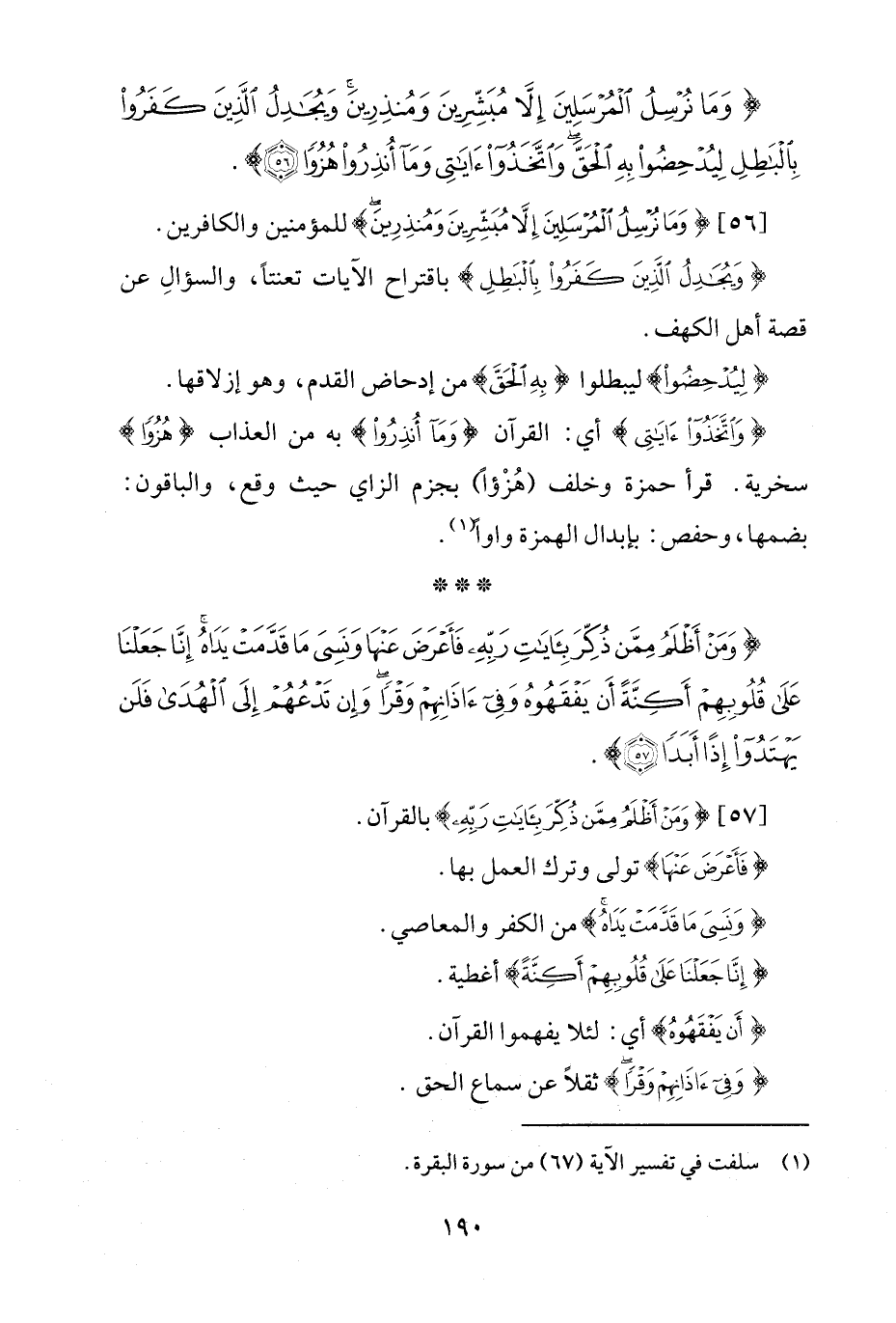 {وَمَا نُرْسِلُ الْمُرْسَلِينَ إِلَّا مُبَشِّرِينَ وَمُنْذِرِينَ وَيُجَادِلُ الَّذِينَ كَفَرُوا بِالْبَاطِلِ لِيُدْحِضُوا بِهِ الْحَقَّ وَاتَّخَذُوا آيَاتِي وَمَا أُنْذِرُوا هُزُوًا (56)}.