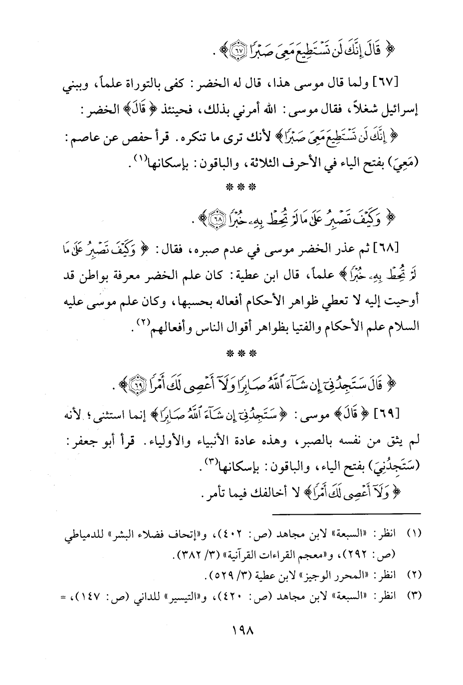 [69] {قَالَ} موسى: {سَتَجِدُنِي إِنْ شَاءَ اللَّهُ صَابِرًا} إنما استثنى؛ لأنه لم يثق من نفسه بالصبر، وهذه عادة الأنبياء والأولياء. قرأ أبو جعفر: (سَتَجِدُنِيَ) بفتح الياء، والباقون: بإسكانها (¬3).