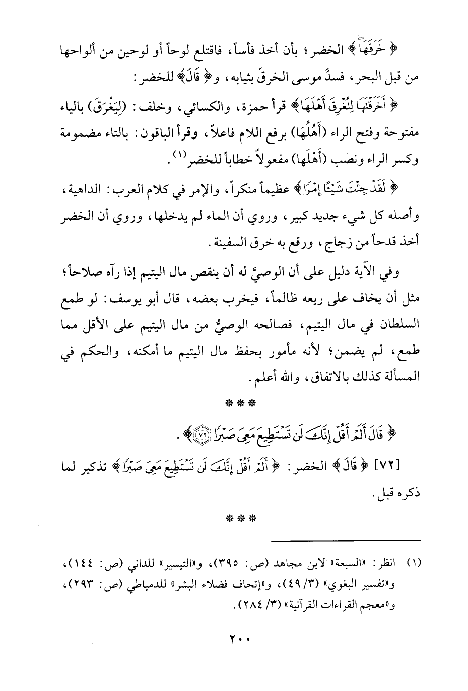 {أَخَرَقْتَهَا لِتُغْرِقَ أَهْلَهَا} قرأ حمزة، والكسائي، وخلف: (لِيَغْرَقَ) بالياء مفتوحة وفتح الراء (أَهُلُهَا) برفع اللام فاعلًا، وقرأ الباقون: بالتاء مضمومة وكسر الراء ونصب (أَهْلَها) مفعولًا خطابًا للخضر (¬1).