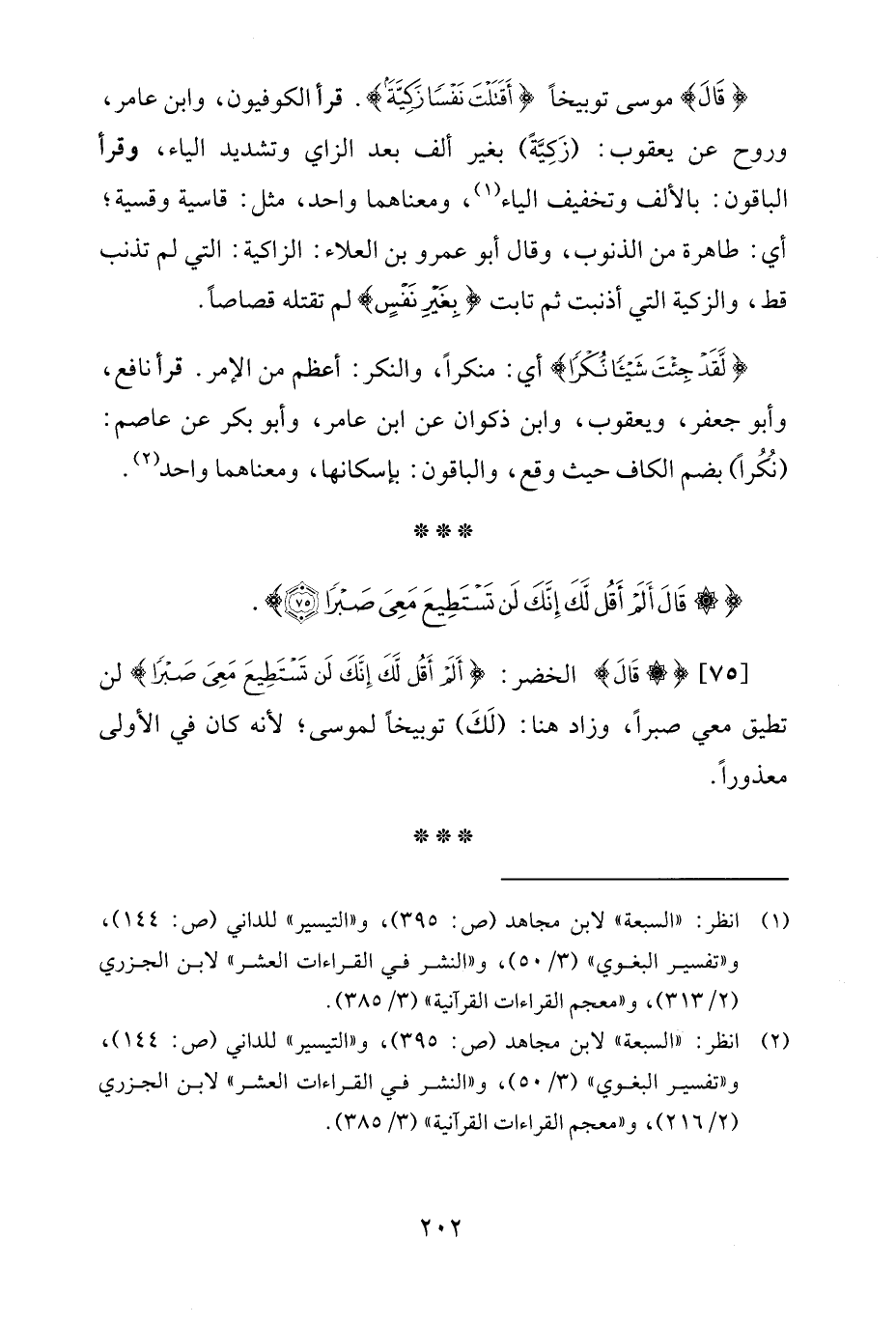 {قَالَ} موسى توبيخًا {أَقَتَلْتَ نَفْسًا زَكِيَّةً}. قرأ الكوفيون، وابن عامر، وروح عن يعقوب: (زَكِيَّةً) بغير ألف بعد الزاي وتشديد الياء، وقرأ الباقون: بالألف وتخفيف الياء (¬1)، ومعناهما واحد، مثل: قاسية وقسية؛ أي: طاهرة من الذنوب، وقال أبو عمرو بن العلاء: الزاكية: التي لم تذنب قط، والزكية التي أذنبت ثم تابت {بِغَيْرِ نَفْسٍ} لم تقتله قصاصًا.