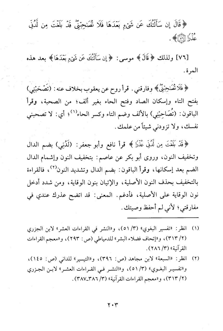 {قَدْ بَلَغْتَ مِنْ لَدُنِّي عُذْرًا} قرأ نافع وأبو جعفر: (لَدُنِي) بضم الدال وتخفيف النون، وروى أبو بكر عن عاصم: بتخفيف النون وإشمام الدال الضم بعد إسكانها، وقرأ الباقون: بضم الدال وتشديد النون (¬2)، فالقراءة بالتخفيف بحذف النون الأصلية، والإتيان بنون الوقاية، ومن شدد أدخل نون الوقاية على الأصلية، فأدغم. المعنى: قد اتضح عذرك عندي في مفارقتي؛ لأني لم أحفظ وصيتك.