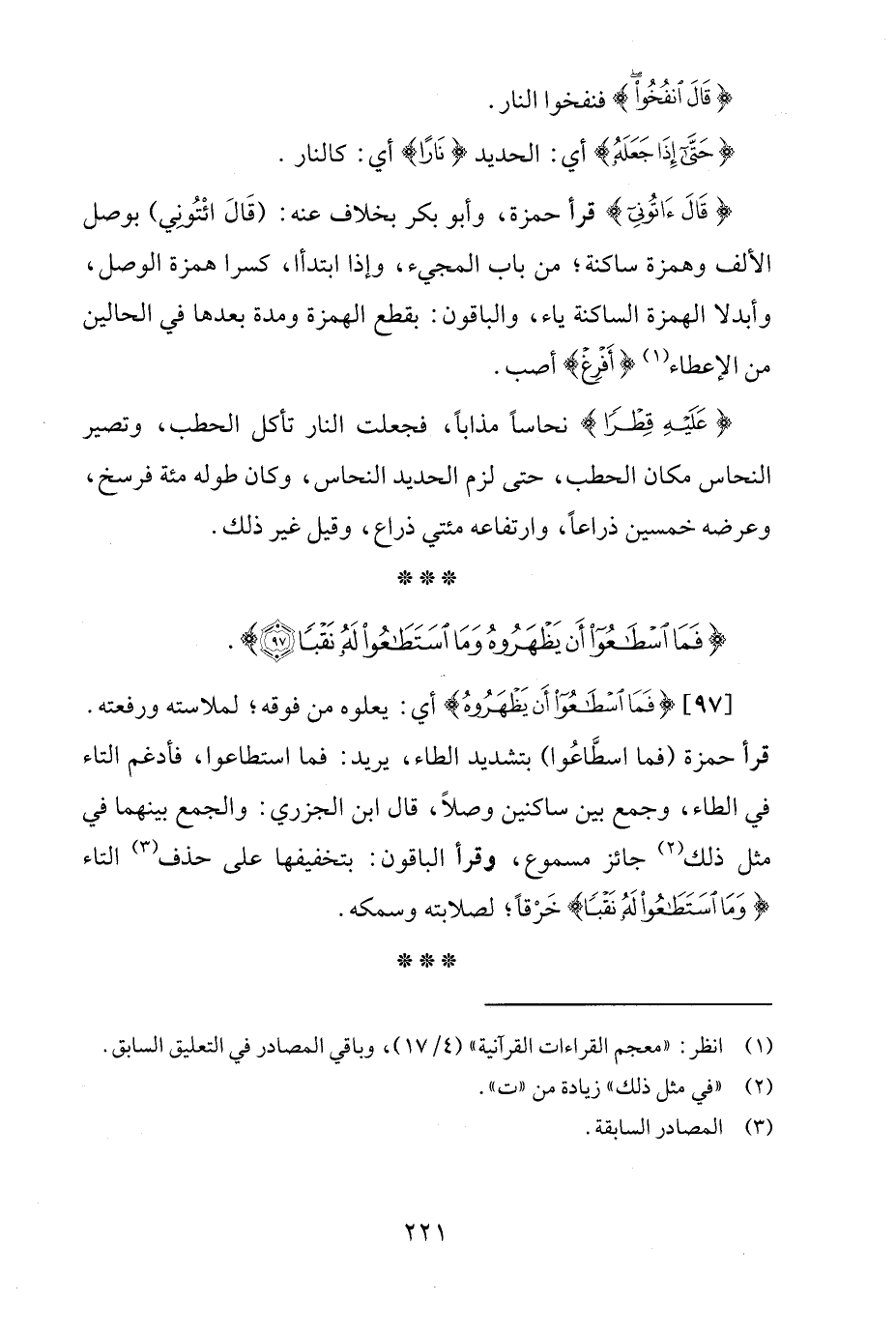 قرأ حمزة (فما اسطَّاعُوا) بتشديد الطاء، يريد: فما استطاعوا، فأدغم التاء في الطاء، وجمع بين ساكنين وصلًا، قال ابن الجزري: والجمع بينهما في مثل ذلك (¬2) جائز مسموع، وقرأ الباقون: بتخفيفها على حذف (¬3) التاء {وَمَا اسْتَطَاعُوا لَهُ نَقْبًا} خَرْقًا؛ لصلابته وسمكه.