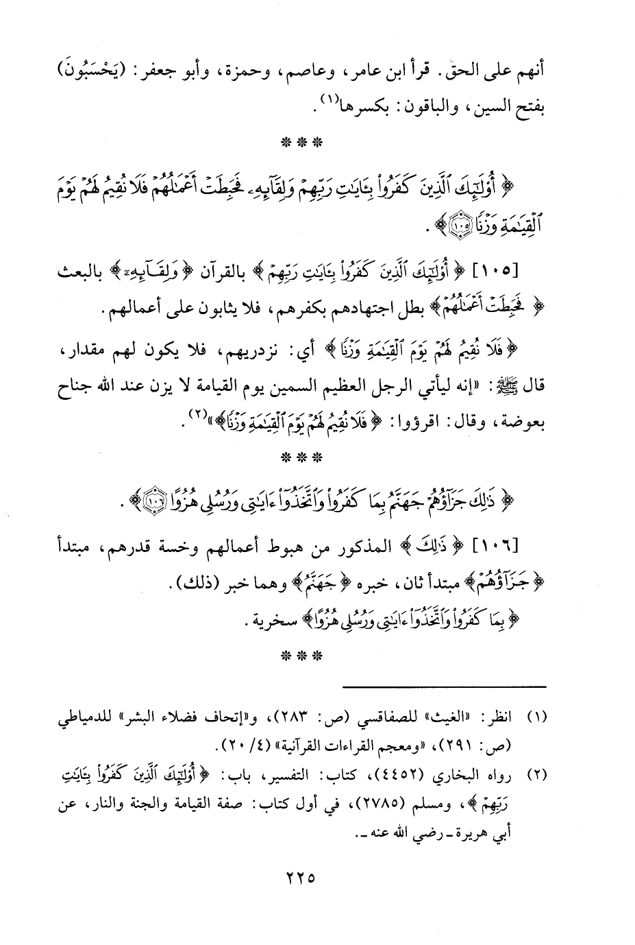 [105] {أُولَئِكَ الَّذِينَ كَفَرُوا بِآيَاتِ رَبِّهِمْ} بالقرآن {وَلِقَائِهِ} بالبعث {فَحَبِطَتْ أَعْمَالُهُمْ} بطل اجتهادهم بكفرهم، فلا يثابون على أعمالهم.