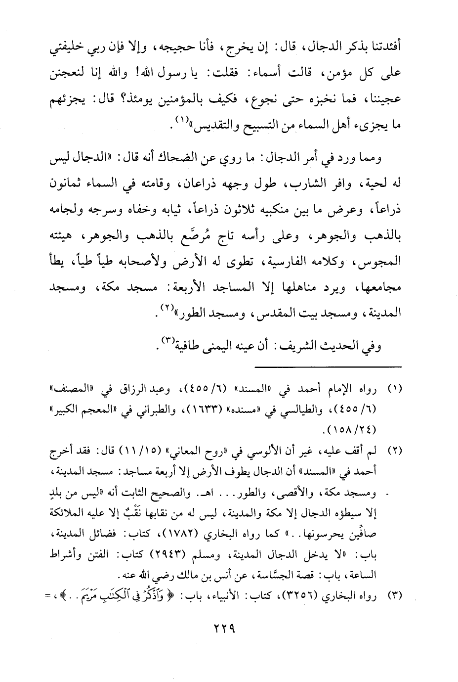ومما ورد في أمر الدجال: ما روي عن الضحاك أنه قال: "الدجال ليس له لحية، وافر الشارب، طول وجهه ذراعان، وقامته في السماء ثمانون ذراعًا، وعرض ما بين منكبيه ثلاثون ذراعًا، ثيابه وخفاه وسرجه ولجامه بالذهب والجوهر، وعلى رأسه تاج مُرصَّع بالذهب والجوهر، هيئته المجوس، وكلامه الفارسية، تطوى له الأرض ولأصحابه طيًّا طيًّا، يطأ مجامعها، ويرد مناهلها إلا المساجد الأربعة: مسجد مكة، ومسجد المدينة، ومسجد بيت المقدس، ومسجد الطور" (¬2).