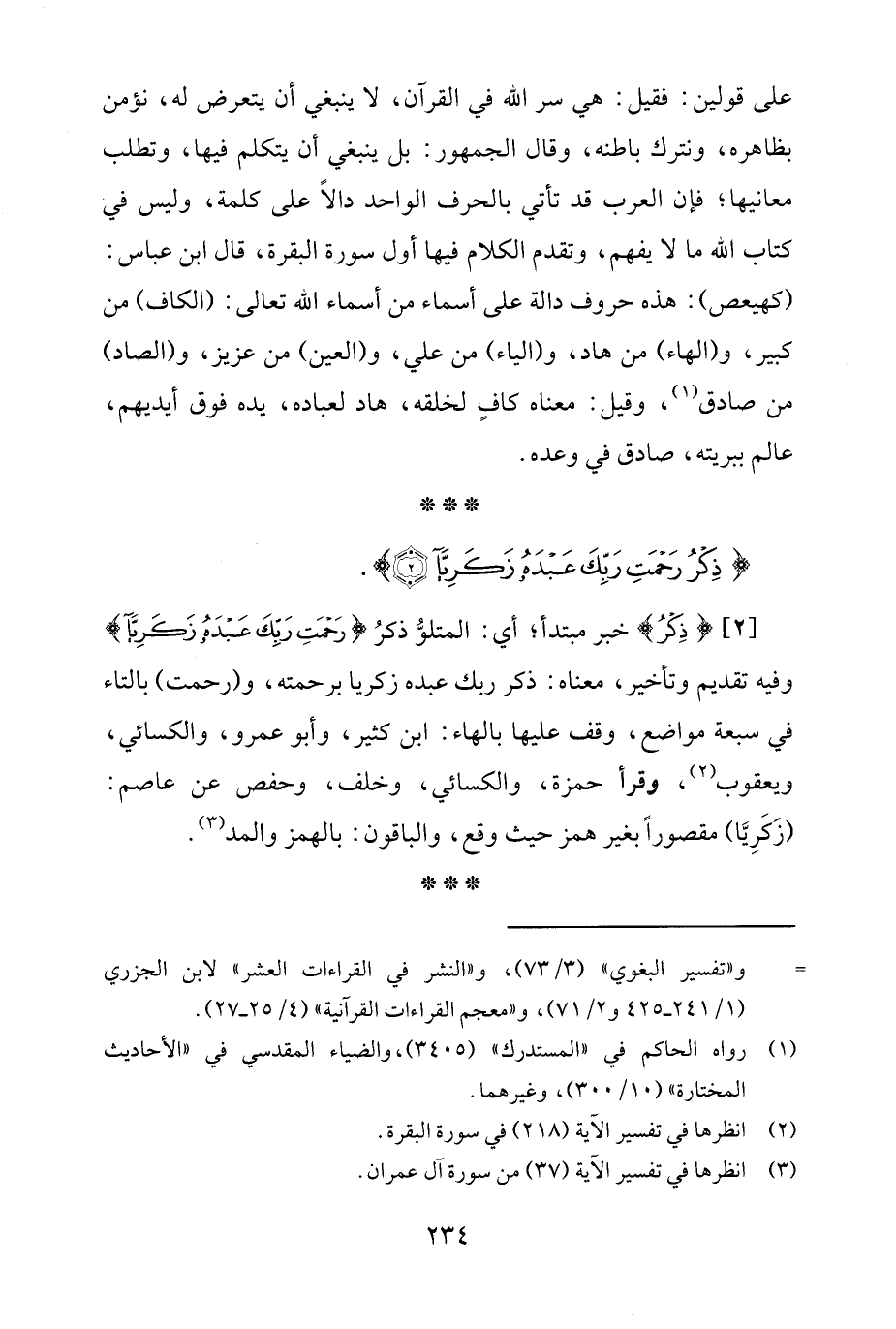 على قولين: فقيل: هي سر الله في القرآن، لا ينبغي أن يتعرض له، نؤمن بظاهره، ونترك باطنه، وقال الجمهور: بل ينبغي أن يتكلم فيها، وتطلب معانيها؛ فإن العرب قد تأتي بالحرف الواحد دالًا على كلمة، وليس في كتاب الله ما لا يفهم، وتقدم الكلام فيها أول سورة البقرة، قال ابن عباس: (كهيعص): هذه حروف دالة على أسماء من أسماء الله تعالى: (الكاف) من كبير، و (الهاء) من هاد، و (الياء) من علي، و (العين) من عزيز، و (الصاد) من صادق (¬1)، وقيل: معناه كافٍ لخلقه، هاد لعباده، يده فوق أيديهم، عالم ببريته، صادق في وعده.