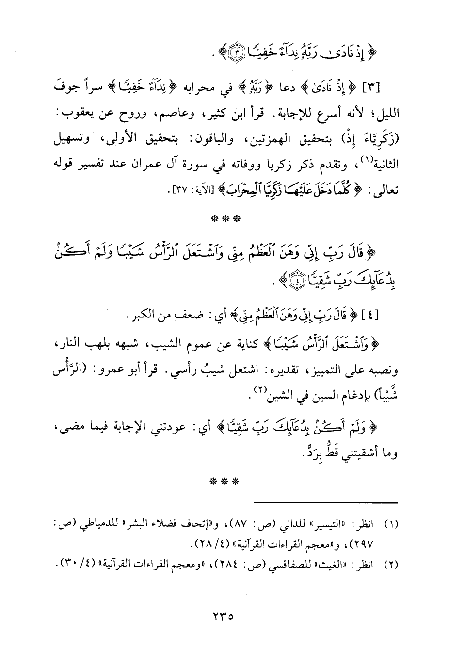 [3] {إِذْ نَادَى} دعا {رَبَّهُ} في محرابه {نِدَاءً خَفِيًّا} سرًّا جوفَ الليل؛ لأنه أسرع للإجابة. قرأ ابن كثير، وعاصم، وروح عن يعقوب: (زَكَرِيَّاءَ إِذْ) بتحقيق الهمزتين، والباقون: بتحقيق الأولى، وتسهيل الثانية (¬1)، وتقدم ذكر زكريا ووفاته في سورة آل عمران عند تفسير قوله تعالى: {كُلَّمَا دَخَلَ عَلَيْهَا زَكَرِيَّا الْمِحْرَابَ} [آل عمران: 37].