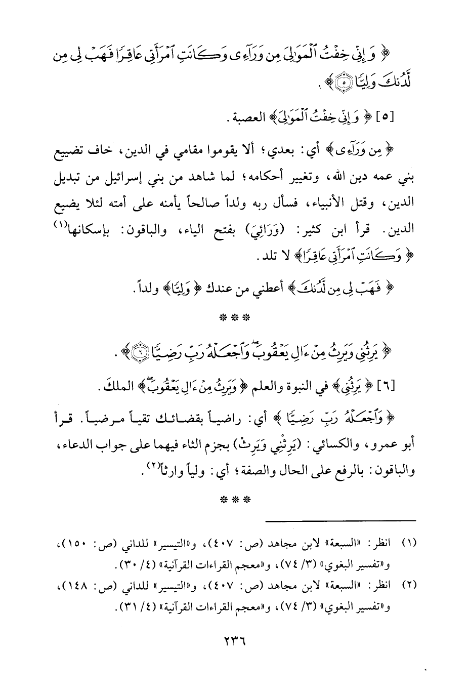 {وَاجْعَلْهُ رَبِّ رَضِيًّا} أي: راضيًا بقضائك تقيًّا مرضيًّا. قرأ أبو عمرو، والكسائي: (يَرِثْنِي وَيَرِثْ) بجزم الثاء فيهما على جواب الدعاء، والباقون: بالرفع على الحال والصفة؛ أي: وليًّا وارثًا (¬2).