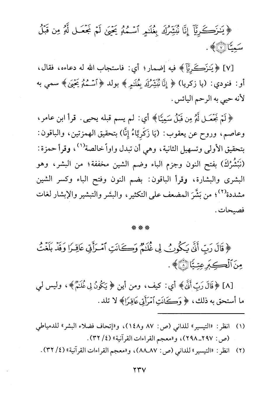 {لَمْ نَجْعَلْ لَهُ مِنْ قَبْلُ سَمِيًّا} أي: لم يسم قبله يحيى. قرأ ابن عامر، وعاصم، وروح عن يعقوب: (يَا زَكَرِيَّاءُ إِنَّا) بتحقيق الهمزتين، والباقون: بتحقيق الأولى وتسهيل الثانية، وهي أن تبدل واوًا خالصة (¬1)، وقرأ حمزة: (نَبْشُرُكَ) بفتح النون وجزم الباء وضم الشين مخففة، من البشر، وهو البشرى والبشارة، وقرأ الباقون: بضم النون وفتح الباء وكسر الشين مشددة (¬2)؛ من بَشَّرَ المضعف على التكثير، والبشر والتبشير والإبشار لغات فصيحات.
