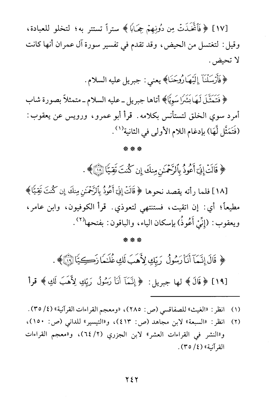 [17] {فَاتَّخَذَتْ مِنْ دُونِهِمْ حِجَابًا} سترًا تستتر به؛ لتخلو للعبادة، وقيل: لتغتسل من الحيض، وقد تقدم في تفسير سورة آل عمران أنها كانت لا تحيض.