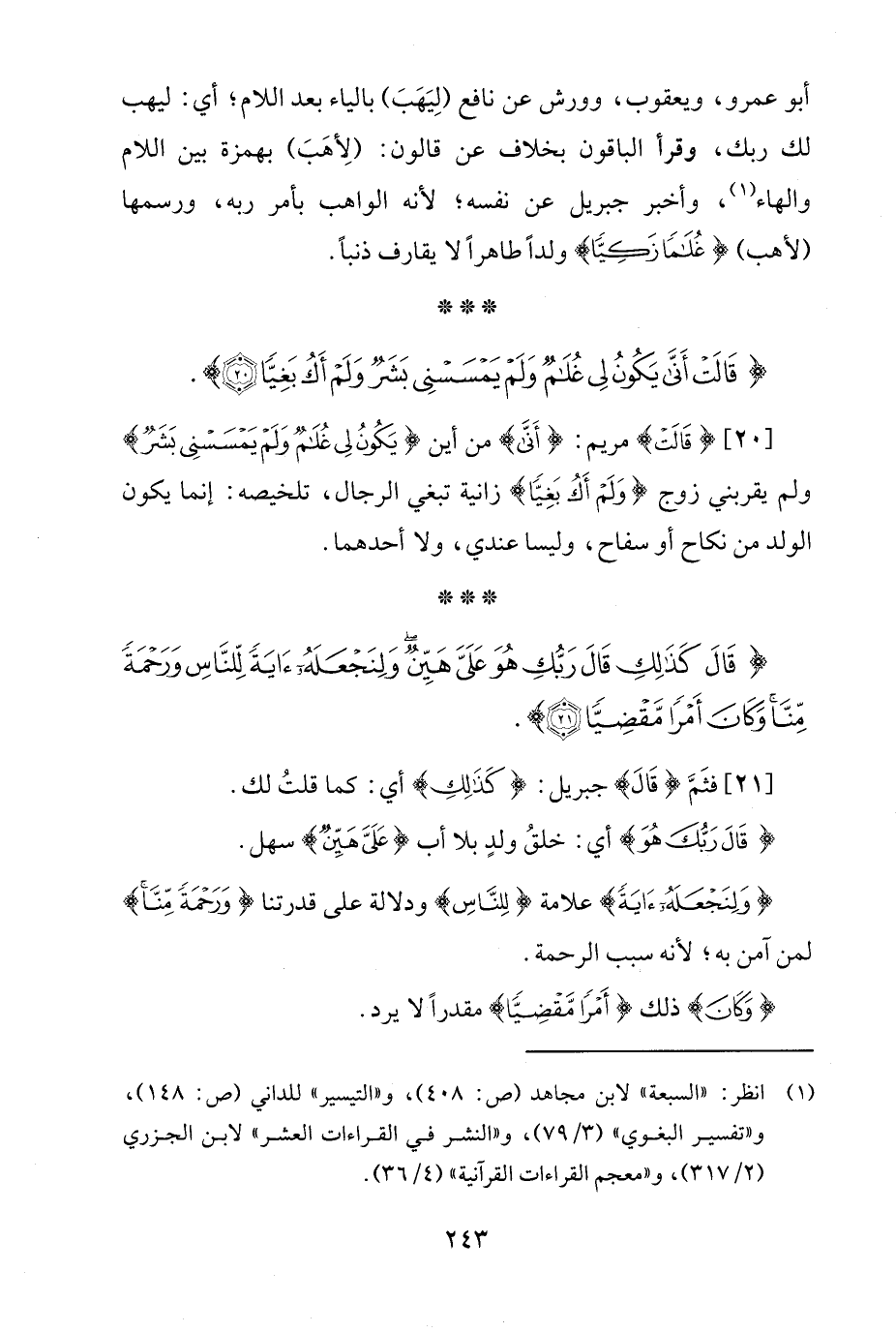 [20] {قَالَتْ} مريم: {أَنَّى} من أين {يَكُونُ لِي غُلَامٌ وَلَمْ يَمْسَسْنِي بَشَرٌ} ولم يقربني زوج {وَلَمْ أَكُ بَغِيًّا} زانية تبغي الرجال، تلخيصه: إنما يكون الولد من نكاح أو سفاح، وليسا عندي، ولا أحدهما.