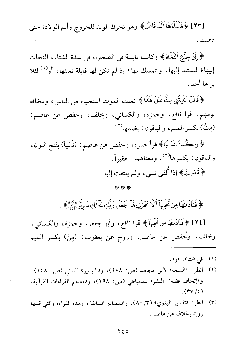 [24] {فَنَادَاهَا مِنْ تَحْتِهَا} قرأ نافع، وأبو جعفر، وحمزة، والكسائي، وخلف، وحفص عن عاصم، وروح عن يعقوب: (مِنْ) بكسر الميم