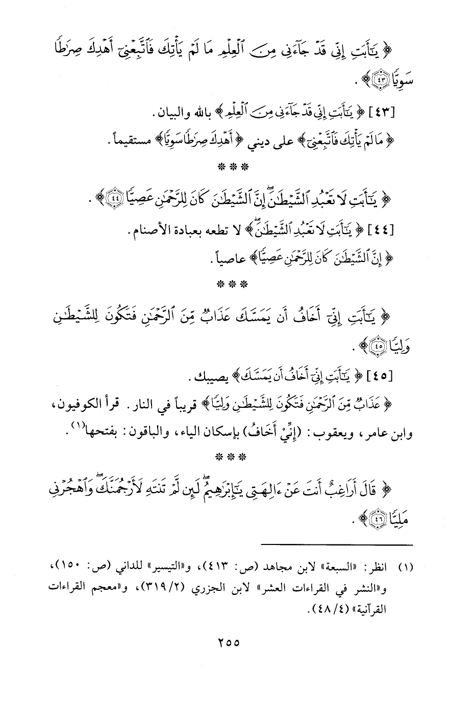 [44] {يَاأَبَتِ لَا تَعْبُدِ الشَّيْطَانَ} لا تطعه بعبادة الأصنام.