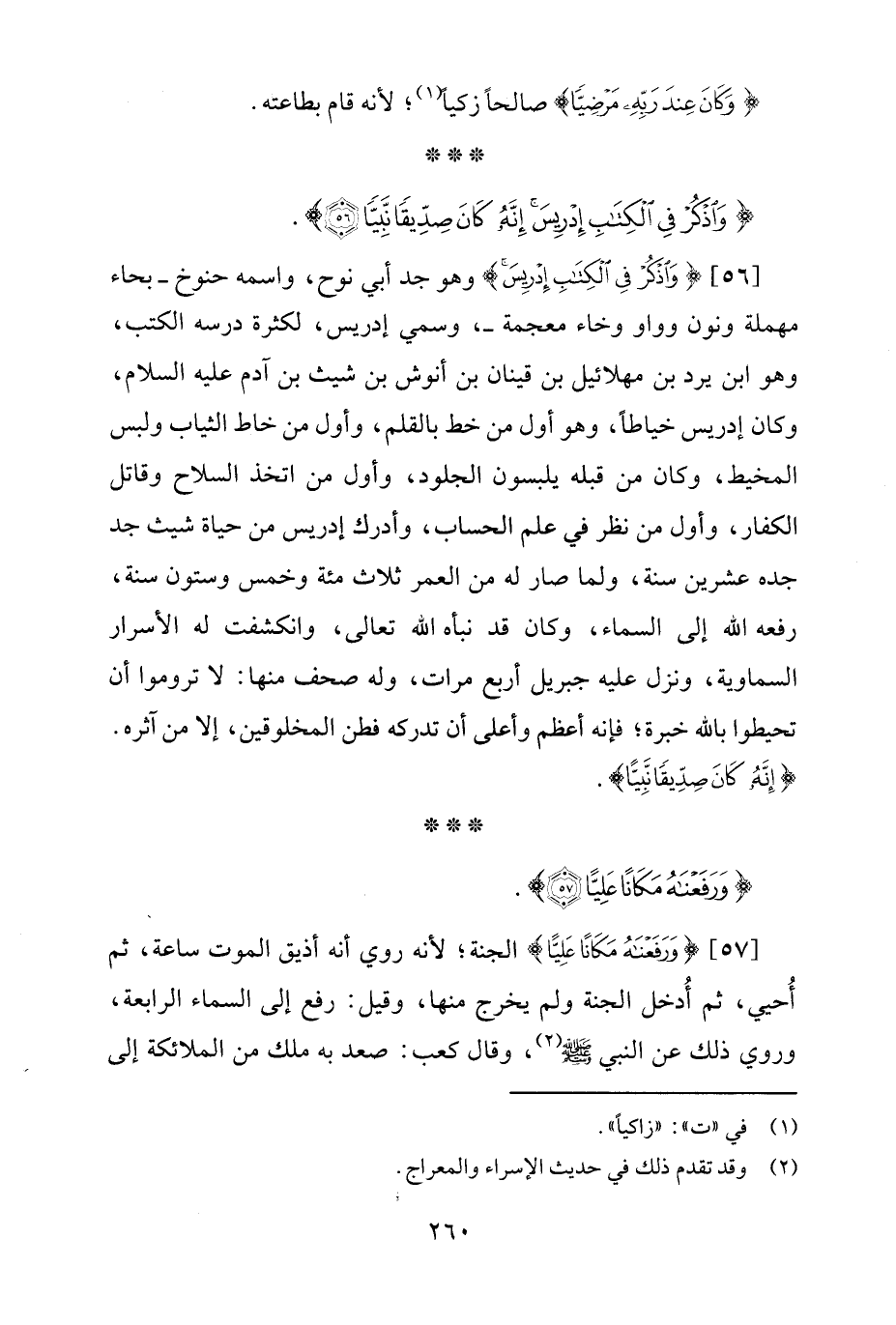 [56] {وَاذْكُرْ فِي الْكِتَابِ إِدْرِيسَ} وهو جد أبي نوح، واسمه حنوخ -بحاء مهملة ونون وواو وخاء معجمة-، وسمي إدريس، لكثرة درسه الكتب، وهو ابن يرد بن مهلائيل بن قينان بن أنوش بن شيث بن آدم عليه السلام، وكان إدريس خياطًا، وهو أول من خط بالقلم، وأول من خاط الثياب ولبس المخيط، وكان من قبله يلبسون الجلود، وأول من اتخذ السلاح وقاتل الكفار، وأول من نظر في علم الحساب، وأدرك إدريس من حياة شيث جد جده عشرين سنة، ولما صار له من العمر ثلاث مئة وخمس وستون سنة، رفعه الله إلى السماء، وكان قد نبأه الله تعالى، وانكشفت له الأسرار السماوية، ونزل عليه جبريل أربع مرات، وله صحف منها: لا تروموا أن تحيطوا بالله خبرة؛ فإنه أعظم وأعلى أن تدركه فطن المخلوقين، إلا من آثره. {إِنَّهُ كَانَ صِدِّيقًا نَبِيًّا}.