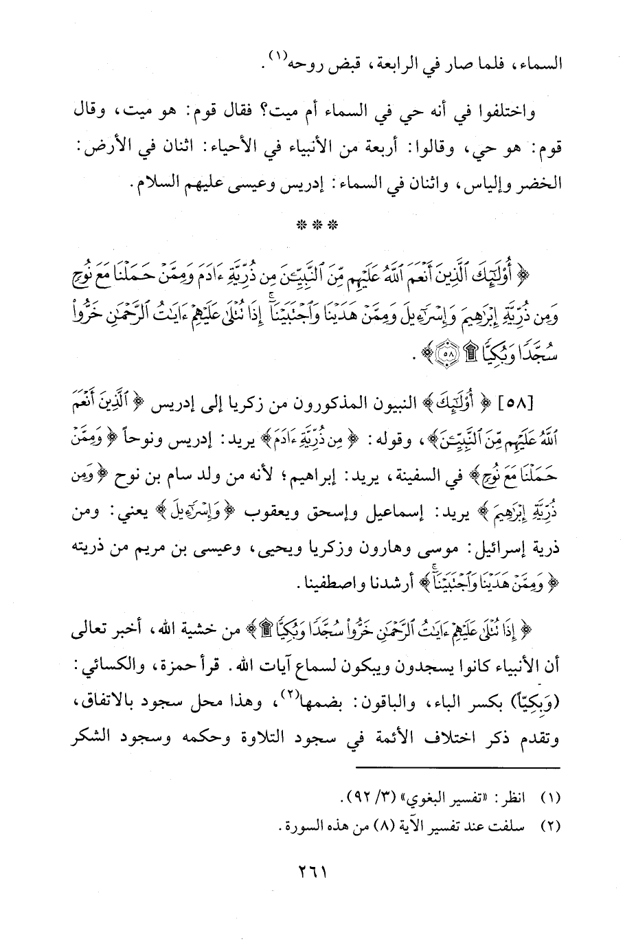 {إِذَا تُتْلَى عَلَيْهِمْ آيَاتُ الرَّحْمَنِ خَرُّوا سُجَّدًا وَبُكِيًّا} من خشية الله، أخبر تعالى أن الأنبياء كانوا يسجدون ويبكون لسماع آيات الله. قرأ حمزة، والكسائي: (وَبكِيًّا) بكسر الباء، والباقون: بضمها (¬2)، وهذا محل سجود بالاتفاق، وتقدم ذكر اختلاف الأئمة في سجود التلاوة وحكمه وسجود الشكر