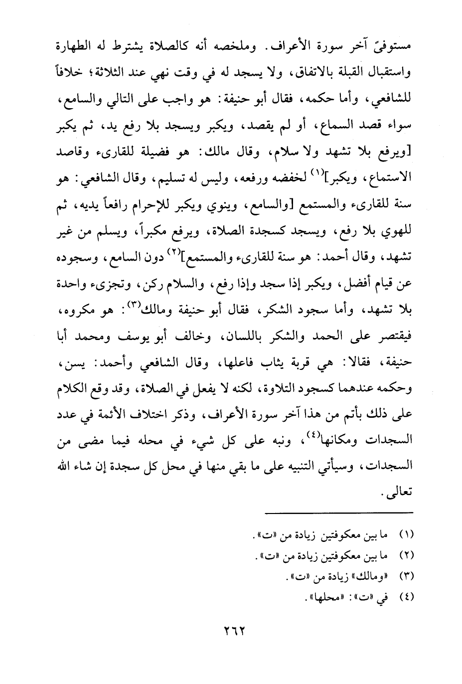مستوفىً آخر سورة الأعراف. وملخصه أنه كالصلاة يشترط له الطهارة واستقبال القبلة بالاتفاق، ولا يسجد له في وقت نهي عند الثلاثة؛ خلافًا للشافعي، وأما حكمه، فقال أبو حنيفة: هو واجب على التالي والسامع، سواء قصد السماع، أو لم يقصد، ويكبر ويسجد بلا رفع يد، ثم يكبر [ويرفع بلا تشهد ولا سلام، وقال مالك: هو فضيلة للقارئ وقاصد الاستماع، ويكبر] (¬1) لخفضه ورفعه، وليس له تسليم، وقال الشافعي: هو سنة للقارئ والمستمع [والسامع، وينوي ويكبر للإحرام رافعًا يديه، ثم للهوي بلا رفع، ويسجد كسجدة الصلاة، ويرفع مكبرًا، ويسلم من غير تشهد، وقال أحمد: هو سنة للقارئ والمستمع] (¬2) دون السامع، وسجوده عن قيام أفضل، ويكبر إذا سجد وإذا رفع، والسلام ركن، وتجزئ واحدة بلا تشهد، وأما سجود الشكر، فقال أبو حنيفة ومالك (¬3): هو مكروه، فيقتصر على الحمد والشكر باللسان، وخالف أبو يوسف ومحمد أبا حنيفة، فقالا: هي قربة يثاب فاعلها، وقال الشافعي وأحمد: يسن، وحكمه عندهما كسجود التلاوة، لكنه لا يفعل في الصلاة، وقد وقع الكلام على ذلك بأتم من هذا آخر سورة الأعراف، وذكر اختلاف الأئمة في عدد السجدات ومكانها (¬4)، ونبه على كل شيء في محله فيما مضى من السجدات، وسيأتي التنبيه على ما بقي منها في محل كل سجدة إن شاء الله تعالى.
