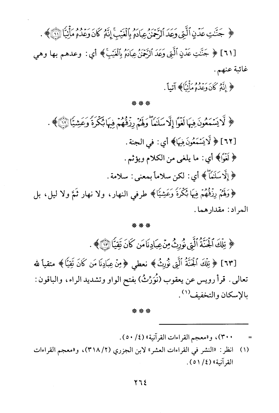 [63] {تِلْكَ الْجَنَّةُ الَّتِي نُورِثُ} نعطي {مِنْ عِبَادِنَا مَنْ كَانَ تَقِيًّا} متقيًا لله تعالى. قرأ رويس عن يعقوب (نُوَرِّثُ) بفتح الواو وتشديد الراء، والباقون: بالإسكان والتخفيف (¬1).